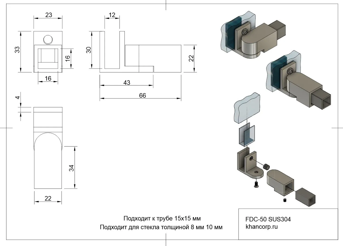 Соединитель предназначен для прочного и надежного крепления круглой металлической трубы диаметром 15 мм к плоской стеклянной панели толщиной до 15 мм. Особенностью данного изделия является наличие специального механизма, который позволяет регулировать угол крепления трубы относительно плоскости стекла, предоставляя возможность выбрать оптимальный наклон и положение для каждого конкретного случая монтажа.