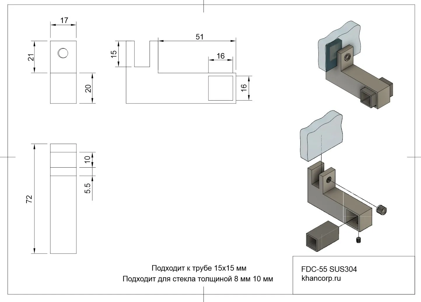 Данный соединитель предназначен для надежного горизонтального крепления прямоугольной трубы сечением 15х15 мм к стеклянной панели толщиной от 8 до 10 мм. Конструктивная особенность соединителя — его способность обеспечивать сквозное крепление, что значительно усиливает надежность фиксации элементов конструкции.