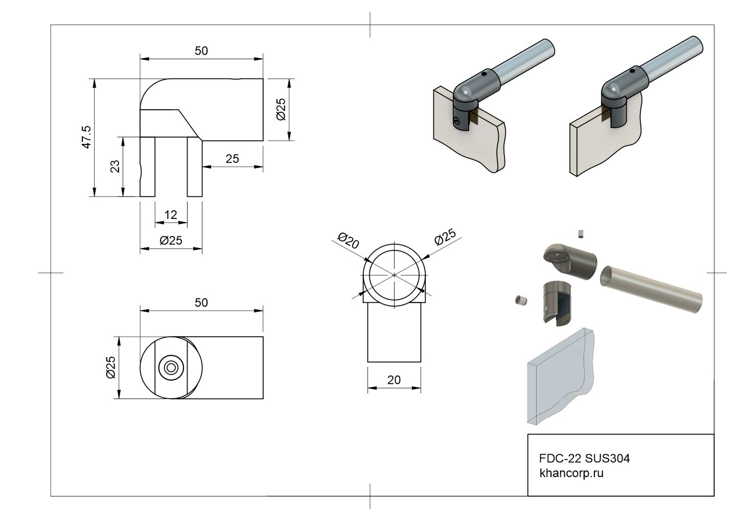 Торцевой держатель стекла FDC-22 предназначен для фиксированного закрепления стеклянных панелей на круглую металлическую трубу диаметром 19 мм, а также может использоваться с трубами диаметром 18 мм. Элемент оснащен механизмом крепления под углом ровно 90 градусов, что обеспечивает жесткую фиксацию и равномерное распределение нагрузок при эксплуатации.