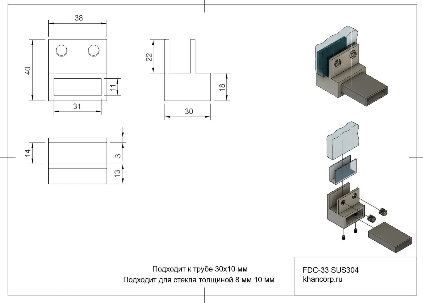 Торцевой держатель стекла FDC-33 предназначен для фиксации стеклянных панелей толщиной от 8 до 10 мм перпендикулярно прямоугольной трубе размером 30х10 мм. Изделие произведено из высокопрочной нержавеющей стали, которая обладает отличным уровнем устойчивости к воздействию влаги, пара и агрессивных компонентов, встречающихся в условиях влажных помещений. Благодаря своей химической нейтральности и механической прочности, соединитель гарантированно прослужит долго, сохранив исходные технические характеристики и безупречный внешний вид.