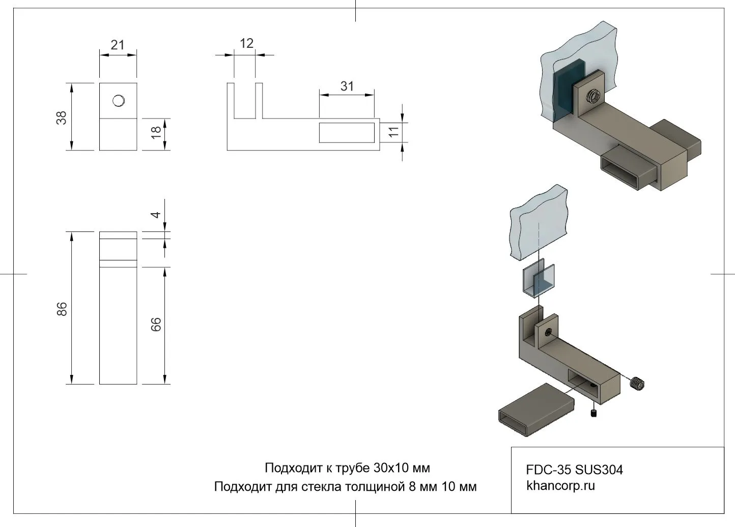 Держатель стекла модели FDC-35 представляет собой высококачественный крепежный элемент, предназначенный специально для надежной фиксации листового стекла толщиной от 8 до 10 миллиметров к металлическим профилям прямоугольного сечения размерами 30 × 10 мм. Материал изготовления — высокопрочная нержавеющая сталь, обеспечивающая устойчивость к коррозионным процессам и другим негативным воздействиям внешней среды. Благодаря этому материалу держатель способен сохранять свои эксплуатационные качества и привлекательный внешний вид даже в условиях повышенной влажности, что особенно важно при применении в помещениях с регулярным воздействием воды, таких как ванные комнаты и санузлы. Крепежная конструкция FDC-35 выполнена таким образом, чтобы обеспечить надежное удерживание стеклянных полотен при создании современных раздвижных дверных систем в душевых кабинах. Этот универсальный аксессуар гарантирует безопасность эксплуатации изделий из закаленного стекла и значительно упрощает монтаж стеклянных панелей различной конфигурации и размеров. Таким образом, использование держателей данной серии существенно повышает функциональность и долговечность конструкции раздвижных стеклянных перегородок и дверей душевых кабин, делая их эксплуатацию комфортной и безопасной на протяжении длительного периода времени.Толщина стекла | 8 мм, 10 мм |