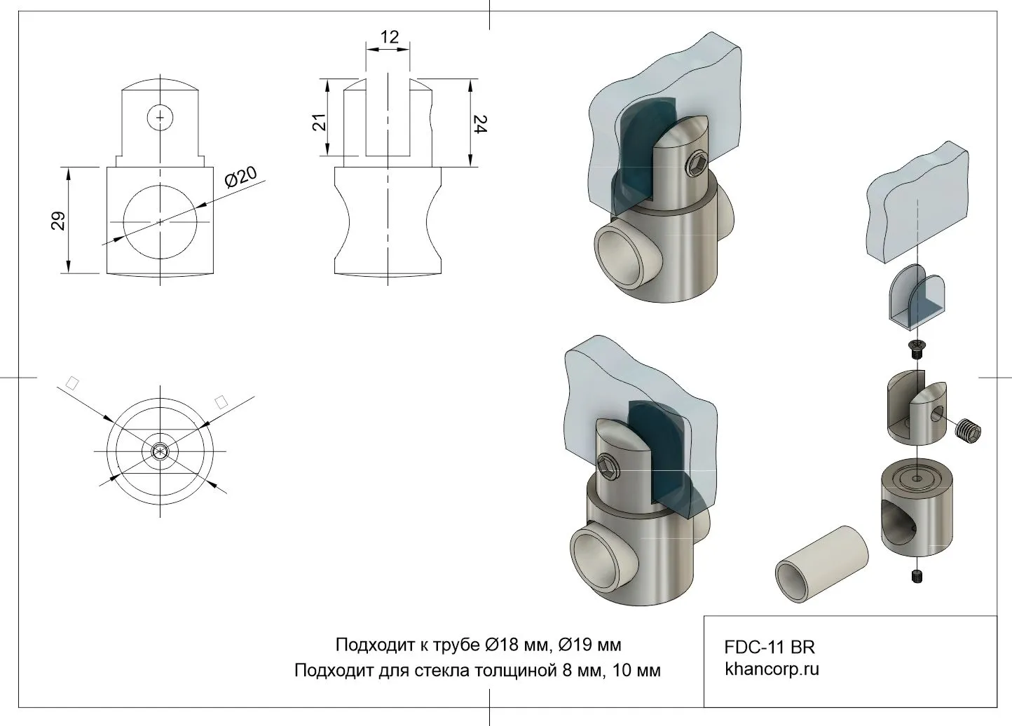 Держатель стекла модели FDC-11 применяется для надёжного закрепления стеклянных панелей на круглых трубах диаметром 19 мм (совместим также с трубами диаметром 18 мм). Изделие изготовлено из износостойкого сплава — латуни, которое обеспечивает устойчивость к внешним воздействиям и долгий срок службы.