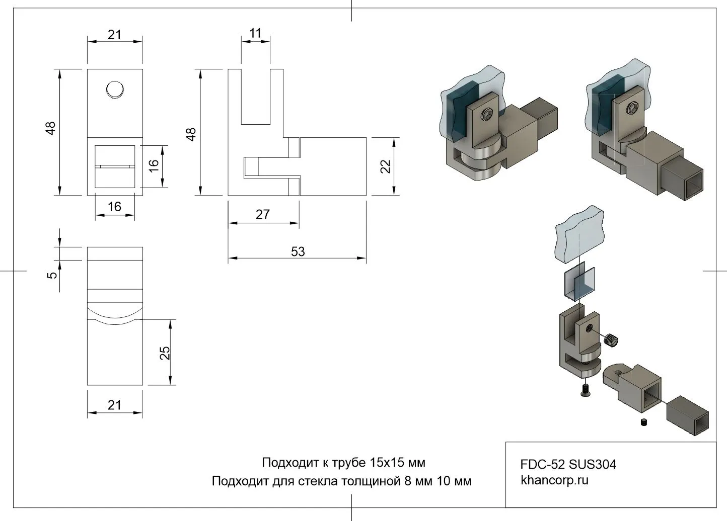 Модель FDC-52 спроектирована специально для надежного и прочного соединения прямоугольной стальной трубы размером 15х15 мм с панелью из прозрачного или матированного стекла толщиной от 8 до 10 мм. Важно отметить, что данная модель оснащена удобным регулятором угла наклона, позволяющим поворачивать трубу относительно стеклянной панели практически на любой угол — от нулевого до полного разворота на 180 градусов. Возможность такой тонкой настройки позволяет свободно варьировать конфигурацию конструкции и находить идеальное положение каждой детали в зависимости от конкретных потребностей.