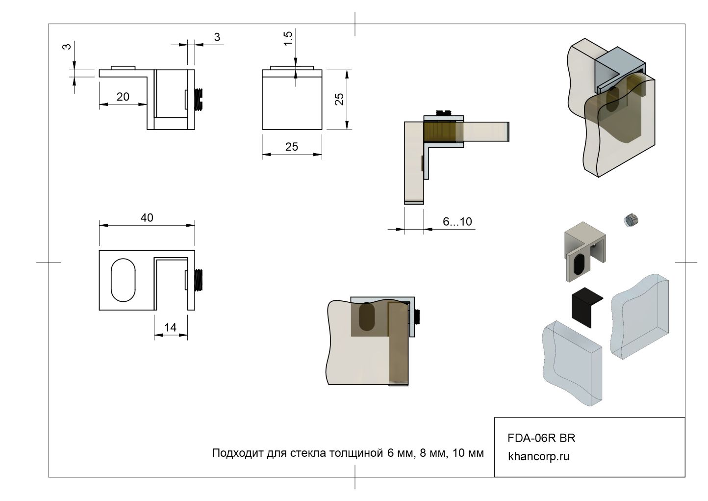 Дверной стопор на 90° левый FDA-06R, предназначен для стекла толщиной от 6 до 12 мм. Он оснащён резиновым демпфером и устанавливается на стекло методом зажима. Этот стопор предназначен для ограничения открывания стеклянных дверей душевых ограждений.