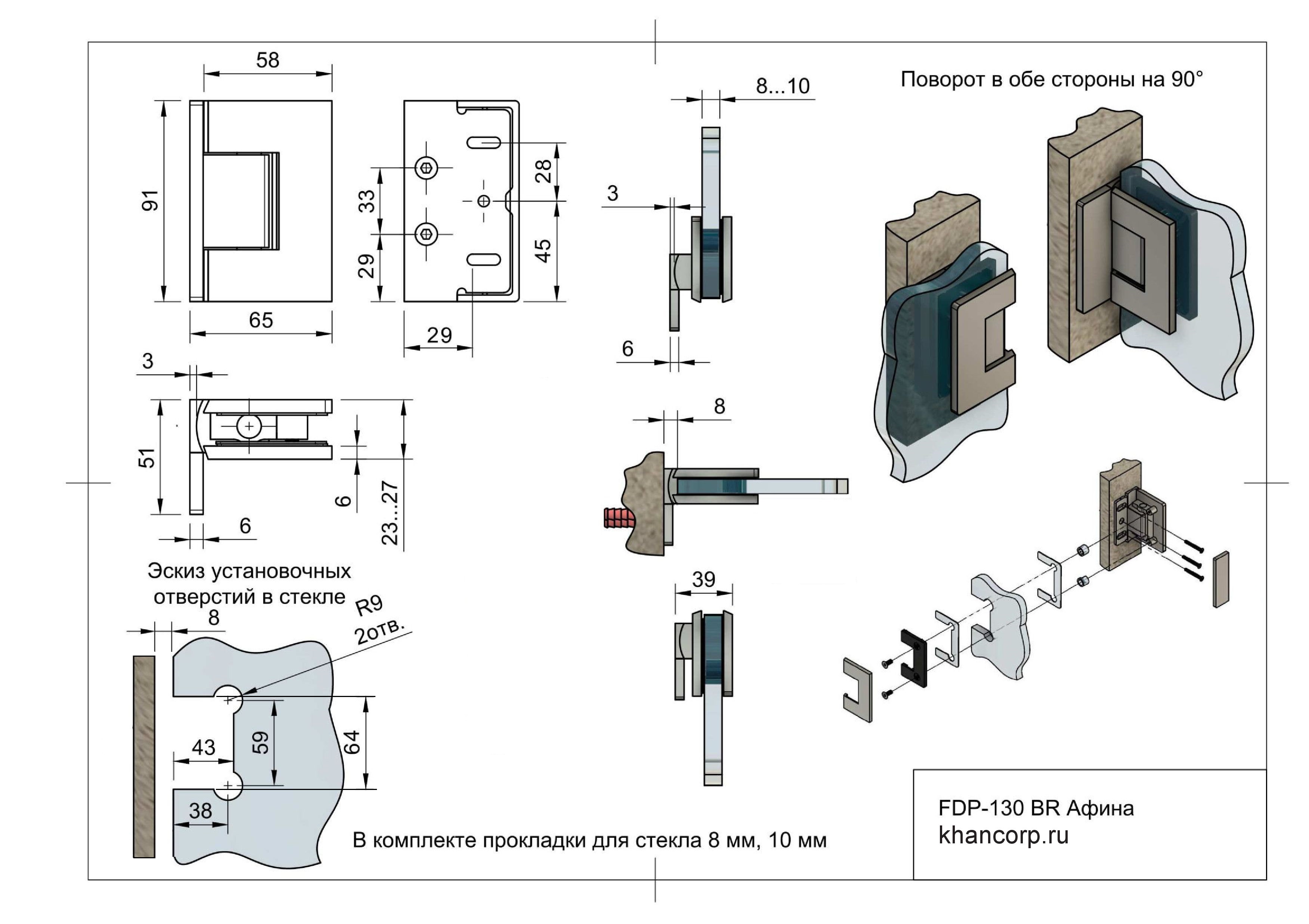 Петля Афина FDP-130 для крепления стеклянной двери к стене под углом 90° – это фурнитура Премиум-класса. Отличительные особенности: декоративные крышки для скрытия креплений, силиконовые вкладыши, идеальная обработка поверхности, увеличенная толщина покрытия, гармоничный дизайн и высококачественные материалы втулок и вкладышей. Петля Афина обеспечивает открывание двери в обе стороны на 90°. Подходит для закаленного стекла толщиной 8 и 10 мм. Изготовлена из высококачественной латуни.
