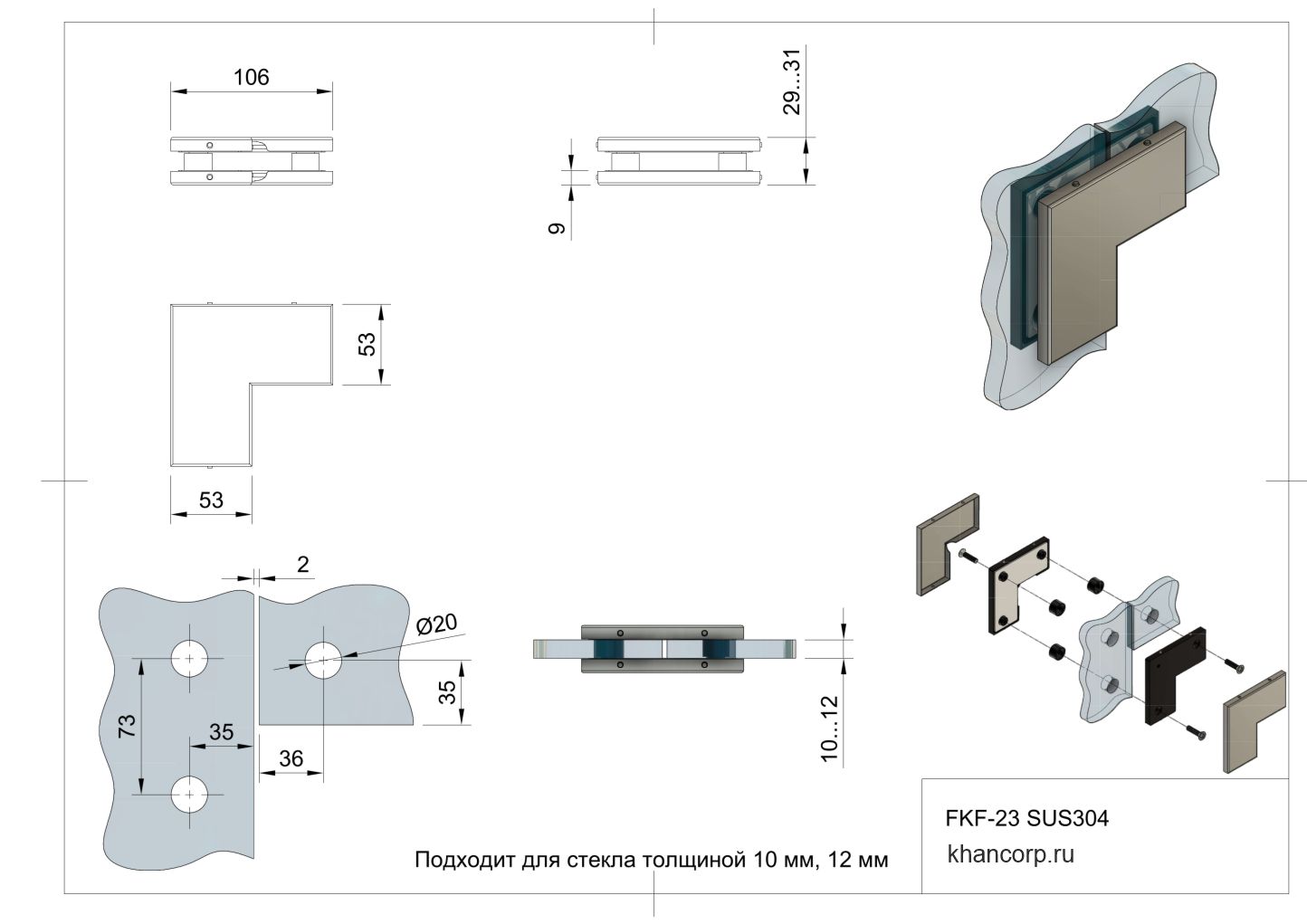 - Артикул: FKF-23 - Материал изготовления: нержавеющая сталь марки SUS304 - Толщина используемого стекла: 10 и 12 мм