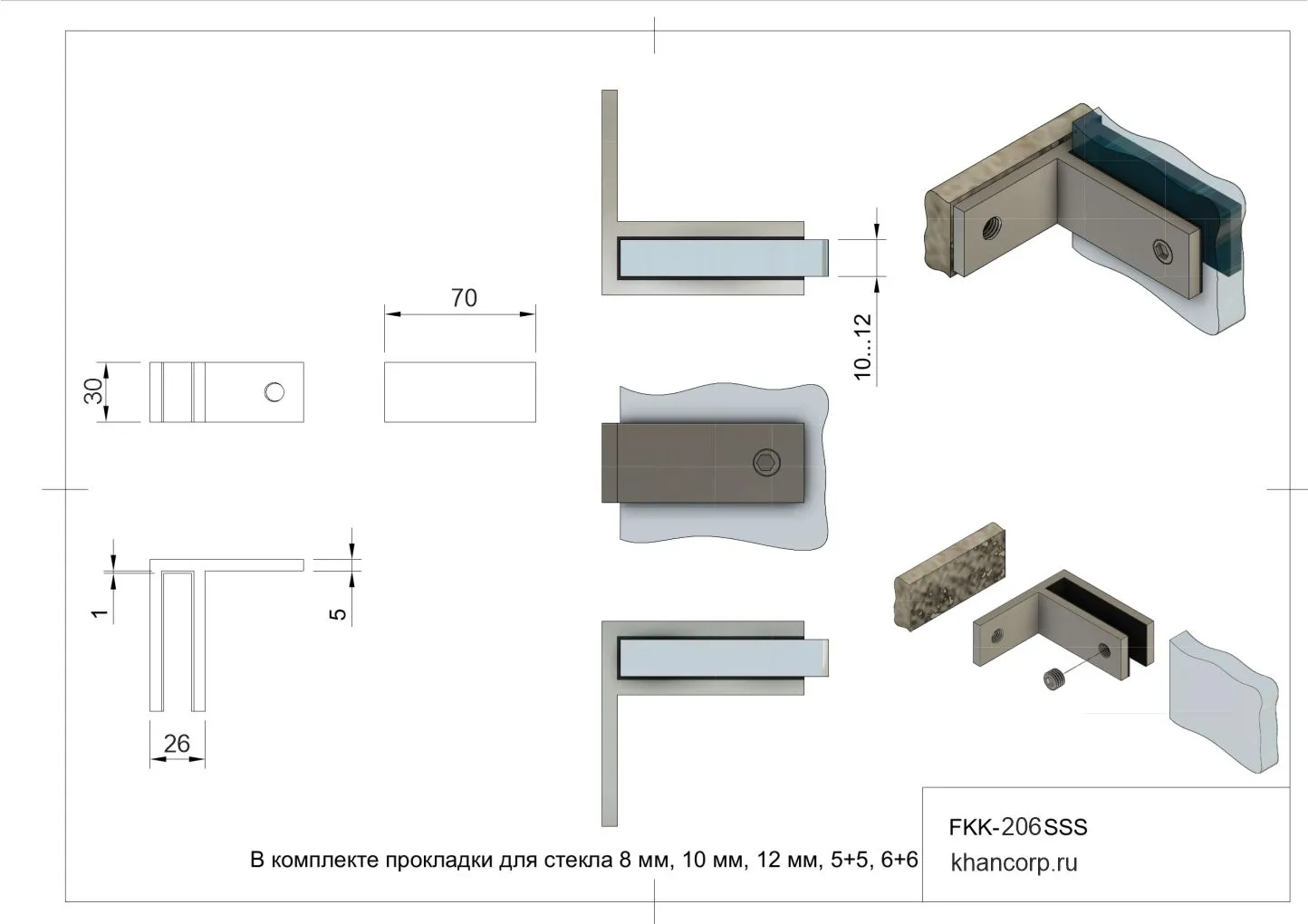 Стеклодержатель для крепления стекла к стене под 90° FKK-206 SUS304/SSS выполнен из нержавеющей стали в матовой отделке.