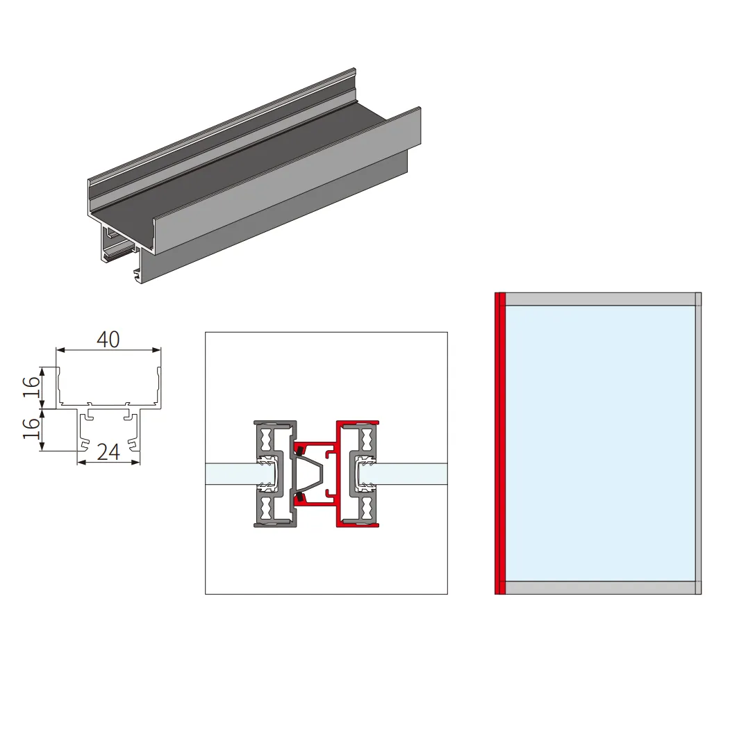 - Верхний и нижний профили: FMPA-6.6 - Боковые профили: FMPA-7.6 - Закрепляются 8 винтами: FMPA-15 - Установка стекла в профиль требует использования уплотнителя FMPA-11.35