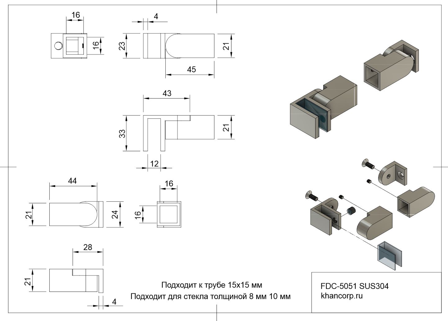 Комплект FDC-5051 предназначен для удобной и надежной установки раздвижных систем стеклянных душевых кабин и включает два специальных крепления для квадратных труб диаметром 15х15 мм. Первое крепление служит для надежного соединения трубы с толстыми стеклянными панелями толщиной от 8 до 10 мм, при этом оно позволяет задать нужный угол наклона от 0° до 180°, обеспечивая максимальное удобство при монтаже. Второе крепление используется для фиксации самой трубы к стене, обеспечивая устойчивое положение конструкции и её долговечность.
