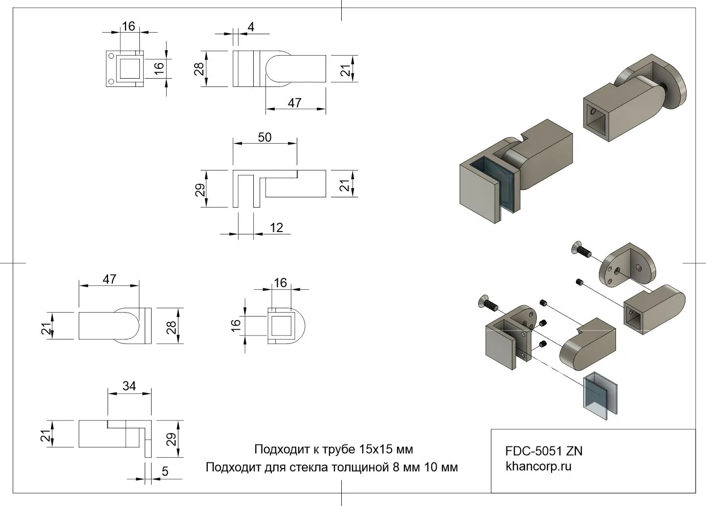 Комплект FDC-5051 предназначен для удобной и надежной установки раздвижных систем стеклянных душевых кабин и включает два специальных крепления для квадратных труб диаметром 15х15 мм. Первое крепление служит для надежного соединения трубы с толстыми стеклянными панелями толщиной от 8 до 10 мм, при этом оно позволяет задать нужный угол наклона от 0° до 180°, обеспечивая максимальное удобство при монтаже. Второе крепление используется для фиксации самой трубы к стене, обеспечивая устойчивое положение конструкции и её долговечность.