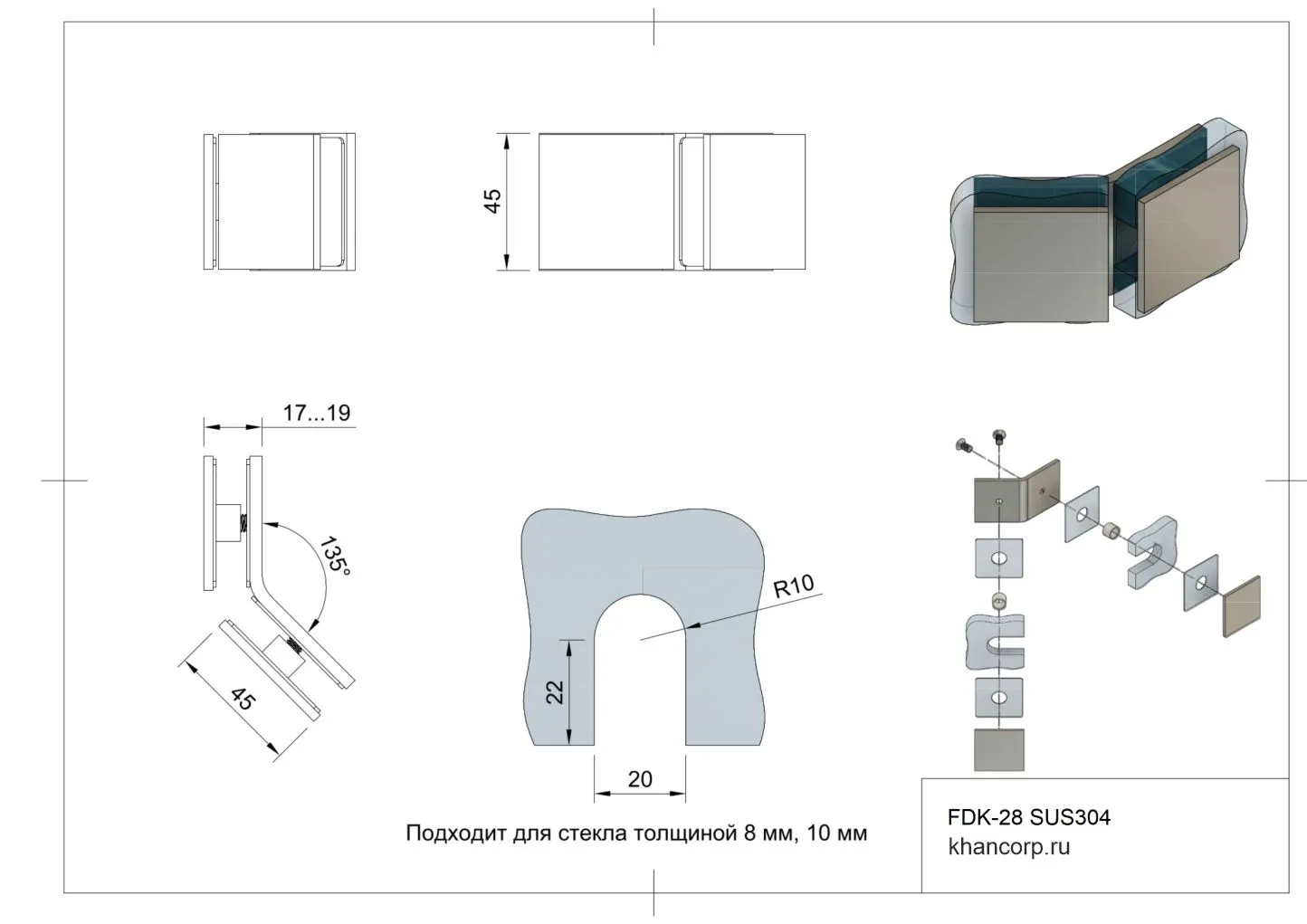 Коннектор для стекла Бета β FDK-28 SUS304/SSS предназначен для крепления закаленного стекла душевых кабин толщиной 6, 8 и 10 мм к стене под углом 135˚. Коннектор высокого качества, выполнен из нержавеющей стали в матовой отделке.