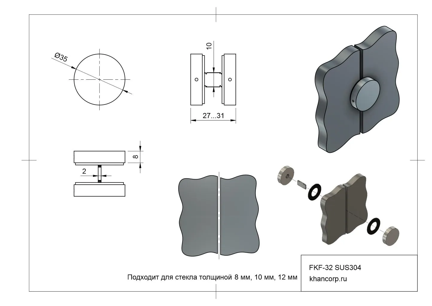 Соединитель для стекла без сверления FKF-32 изготовлен из высококачественной нержавеющей стали SUS304. Диаметр коннектора составляет 35 мм, высота каждого сегмента — 8 мм. Используется для надежного соединения стеклянных полотен между собой.