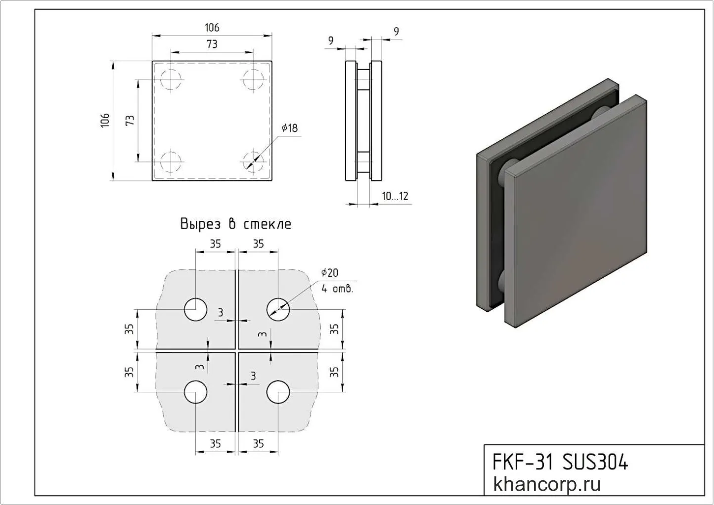 Коннектор FKF-31 для соединения четырёх панелей изготовлен из высококачественной нержавеющей стали SUS304. Основное назначение изделия — обеспечение прочного и устойчивого соединения элементов стеклянной перегородки, принимающего на себя основную нагрузку. Крепление осуществляется путём предварительной подготовки специальных вырезов между четырьмя панелями, расположенными в единой плоскости. Затем коннектор фиксируют на стеклянных поверхностях с помощью винтов, обеспечивая тем самым надёжную, устойчивую и безопасную конструкцию. Данная система рассчитана на применение с панельным стеклом толщиной 10 и 12 миллиметров.