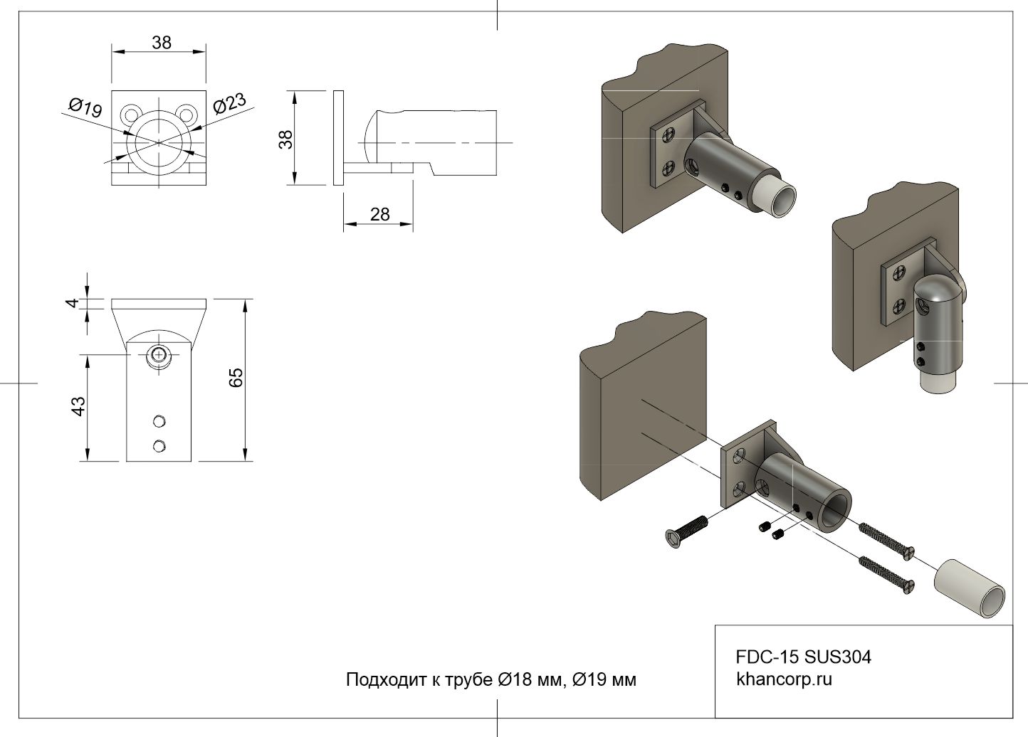 Соединитель FDC-15 представляет собой изделие из нержавеющей стали, предназначенное специально для надежного крепления круглых металлических труб диаметром 19 миллиметров к различным видам стеновых поверхностей — будь то бетонная стена, гипсокартон или кирпичная кладка. Благодаря уникальной конструкции, устройство позволяет осуществлять монтаж трубы под произвольным углом относительно вертикальной оси стены, обеспечивая возможность точного позиционирования крепежного элемента в пространстве. Особенностью соединителя является универсальность размеров: помимо основной рабочей величины диаметра 19 мм, деталь способна надежно зафиксировать трубу меньшего размера — 18 мм, что значительно расширяет область её практического применения.