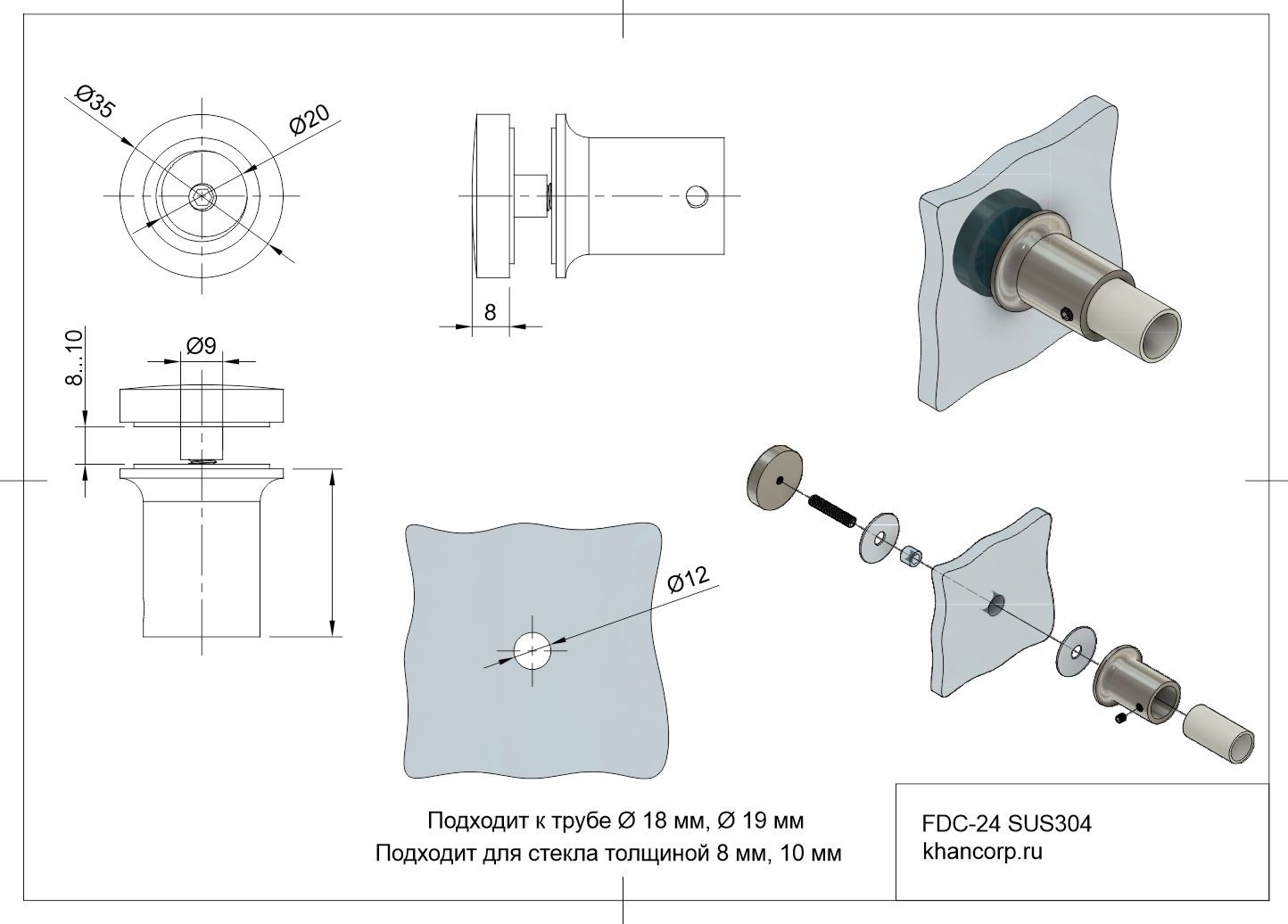 Втулка соединителя оснащена внутренним диаметром 9 мм, который рассчитан на плотное прилегание к трубе указанного размера. Для подготовки отверстия в стеклянной панели предусмотрена рекомендация сверлить отверстие диаметром 12 мм, чтобы исключить повреждение хрупкого материала и создать пространство для беспрепятственного прохождения соединителя. Использование соединителя FDC-24 рекомендовано при устройстве стационарных или подвижных перегородок из закалённого стекла, применяемых в оформлении внутренних пространств жилых домов, общественных зданий и коммерческих объектов. Особенно эффективен он при формировании дизайна прозрачных раздвижных конструкций душевых кабин, ограждений и декоративных панельных решений, обеспечивая одновременно безопасность и эстетику интерьера.