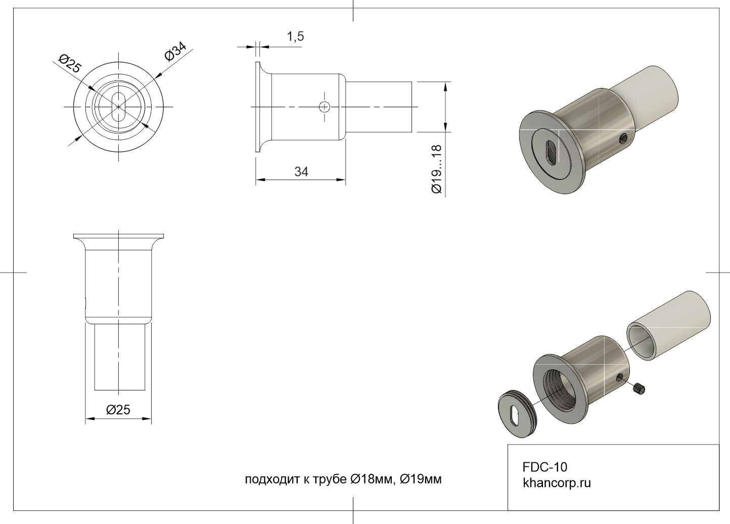 Конструкция элемента допускает использование труб двух стандартных диаметров: основной рабочий диапазон рассчитан на трубу диаметром 19 мм, однако возможна работа и с трубопроводом меньшего размера — 18 мм, что делает данное изделие удобным решением для различных проектов, позволяя компенсировать незначительные отклонения размеров комплектующих. Таким образом, соединитель FDC-10 является важным компонентом в процессе сборки надежных и функциональных раздвижных механизмов душевых кабин.