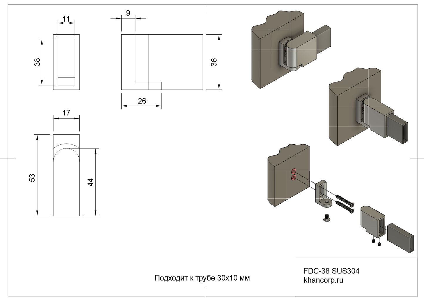 Соединитель FDC-38 произведен из высококачественной нержавеющей стали, что обеспечивает надежную защиту от коррозии и долгий срок службы. Элемент разработан для крепления прямоугольной трубы сечением 30х10 мм непосредственно к стене под переменным углом от 90° до 180°, что даёт свободу выбора оптимального положения при монтаже конструкций.