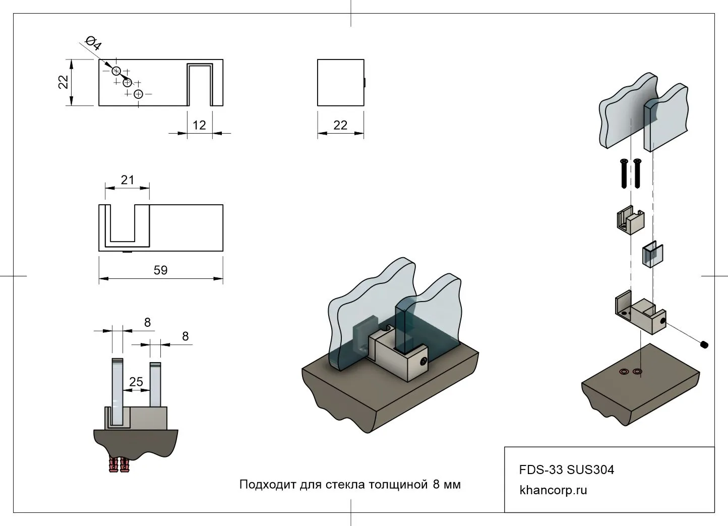 Система FDS-33 включает в себя парную направляющую для установки раздвижных стеклянных дверей. Изготовленная из высококачественной нержавеющей стали марки SUS304, эта направляющая обеспечивает надежную работу даже при значительных весовых нагрузках. Предназначена для использования со стеклом толщиной 8 мм.
