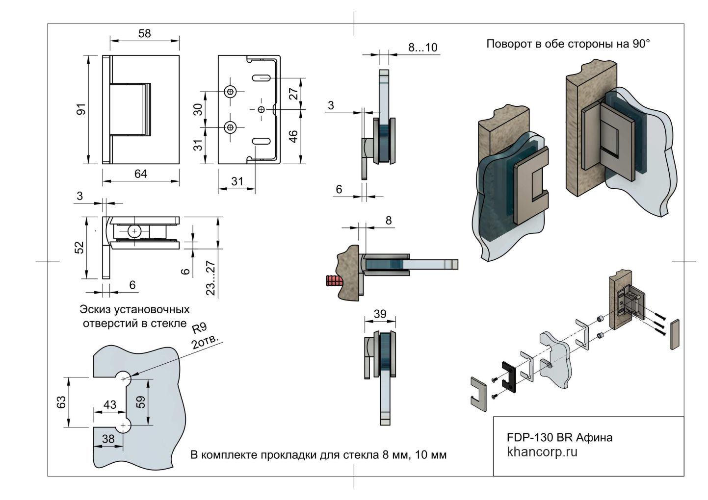 Петля Афина FDP-130 для крепления стеклянной двери к стене под углом 90° – это фурнитура Премиум-класса. Отличительные особенности: декоративные крышки для скрытия креплений, силиконовые вкладыши, идеальная обработка поверхности, увеличенная толщина покрытия, гармоничный дизайн и высококачественные материалы втулок и вкладышей. Петля Афина обеспечивает открывание двери в обе стороны на 90°. Подходит для закаленного стекла толщиной 8 и 10 мм. Изготовлена из высококачественной латуни.