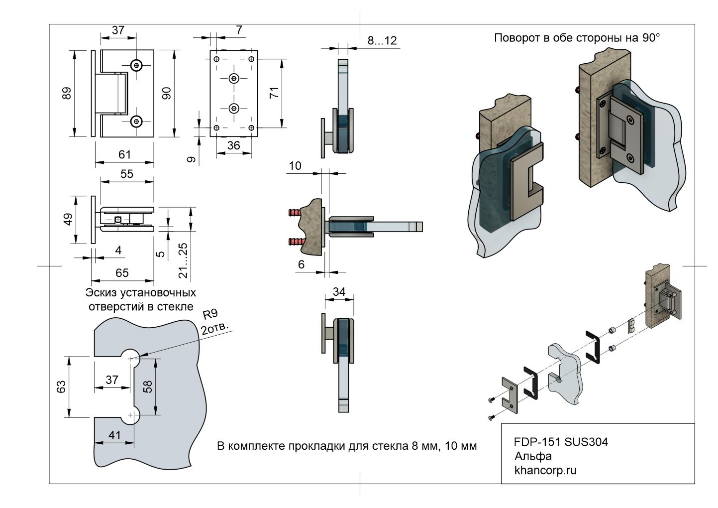 Петля Альфа α Премиум FDP-151 – это петля для фиксации стеклянной двери к стене под углом 90 градусов, соединение стена-стекло, с цельнолитой стенкой толщиной 5 мм. В комплект поставки входят декоративные заглушки из ПВХ, предназначенные для сокрытия креплений, а также резиновые вкладыши. Данная петля относится к премиальному классу фурнитуры для стеклянных дверей, что характеризуется: безупречной поверхностью покрытия, увеличенной толщиной хромированного слоя, сбалансированным дизайном, а также улучшенными материалами втулок и вкладышей. Петля позволяет стеклянной двери открываться на 90° в обе стороны. Предназначена для использования с закаленным стеклом толщиной 8, 10 и 12 мм. Изготовлена из нержавеющей стали высокого качества.