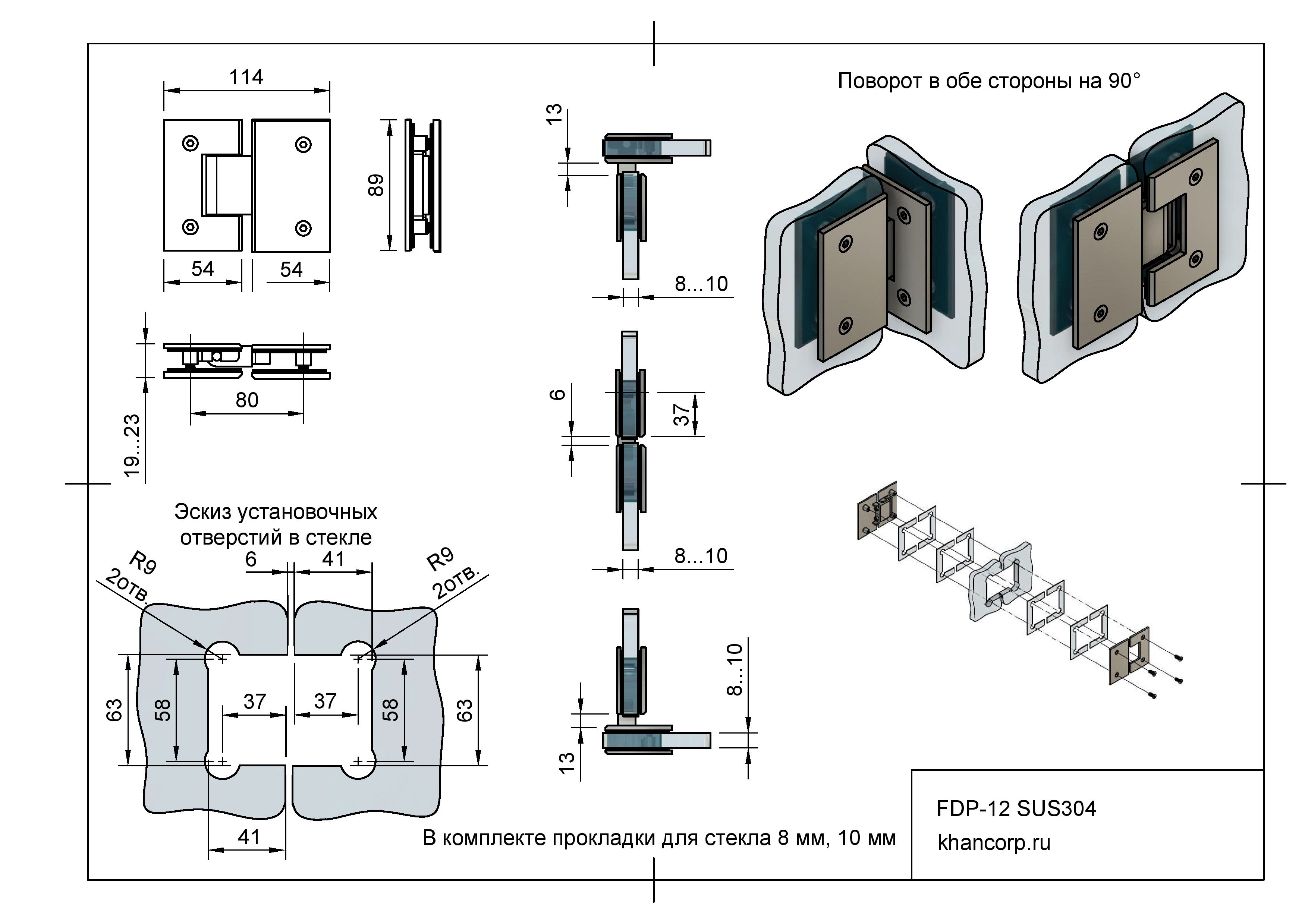 Петля Альфа FDP-12 SUS304 предназначена для стеклянной двери к стационарному стеклу под углом 180°, стекло-стекло. Душевая петля Альфа обеспечивает открывание в обе стороны по 90° в каждую. Предназначена для дверей из закаленного стекла толщиной 8, 10 мм. Выполнена из высококачественной нержавеющей стали, без фаски, является полновесным изделием, вес петли составляет 850 гр. Является аналогом петли Альфа с фаской, петли Бета FDP-22 SUS304.