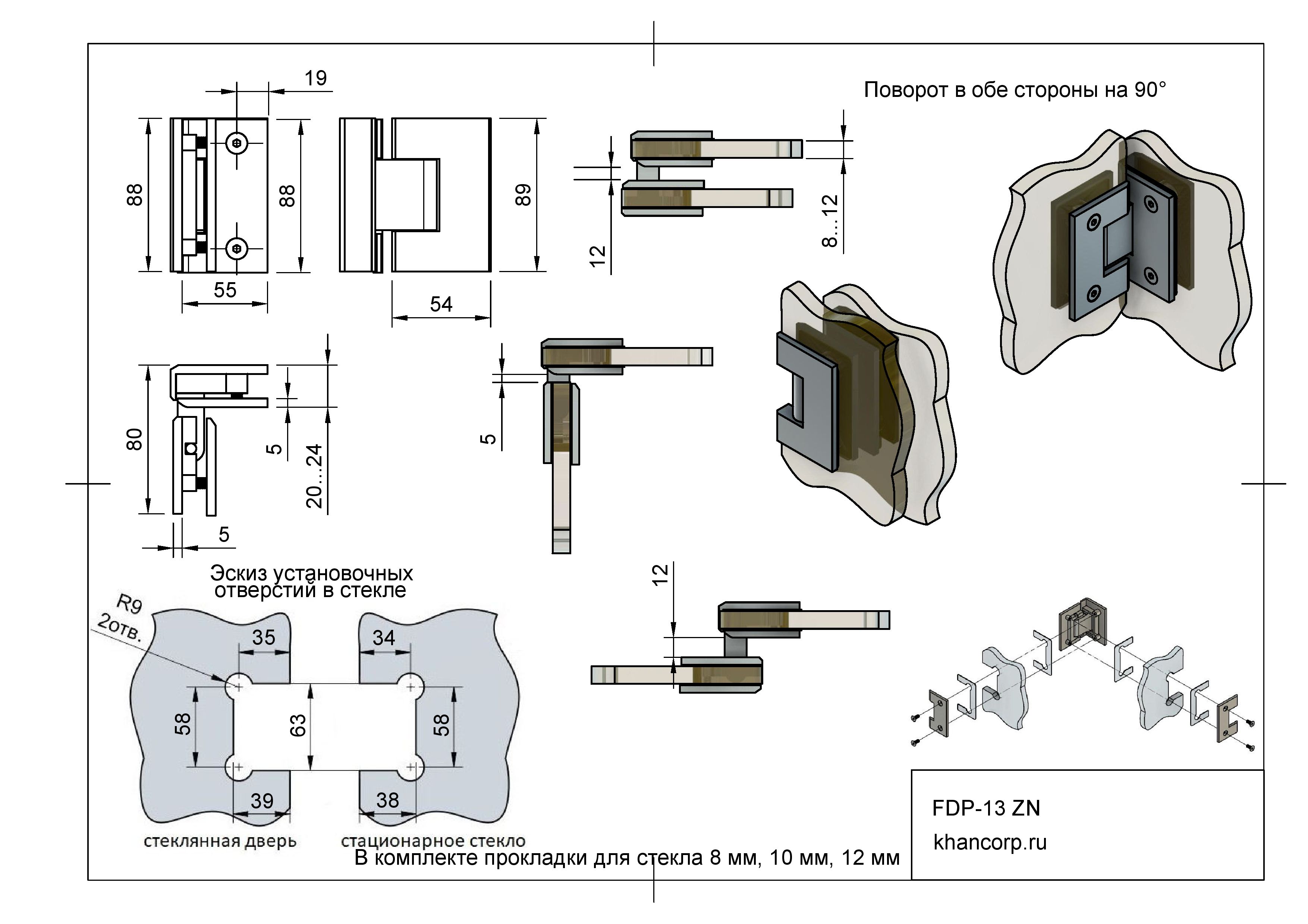Петля Альфа FDP-13 для душевых кабин: крепит стеклянную дверь к неподвижному стеклу под прямым углом (90°). Конструкция "стекло-стекло" позволяет открывать дверь в обе стороны на 90 градусов. Подходит для закаленного стекла толщиной 8-12 мм.