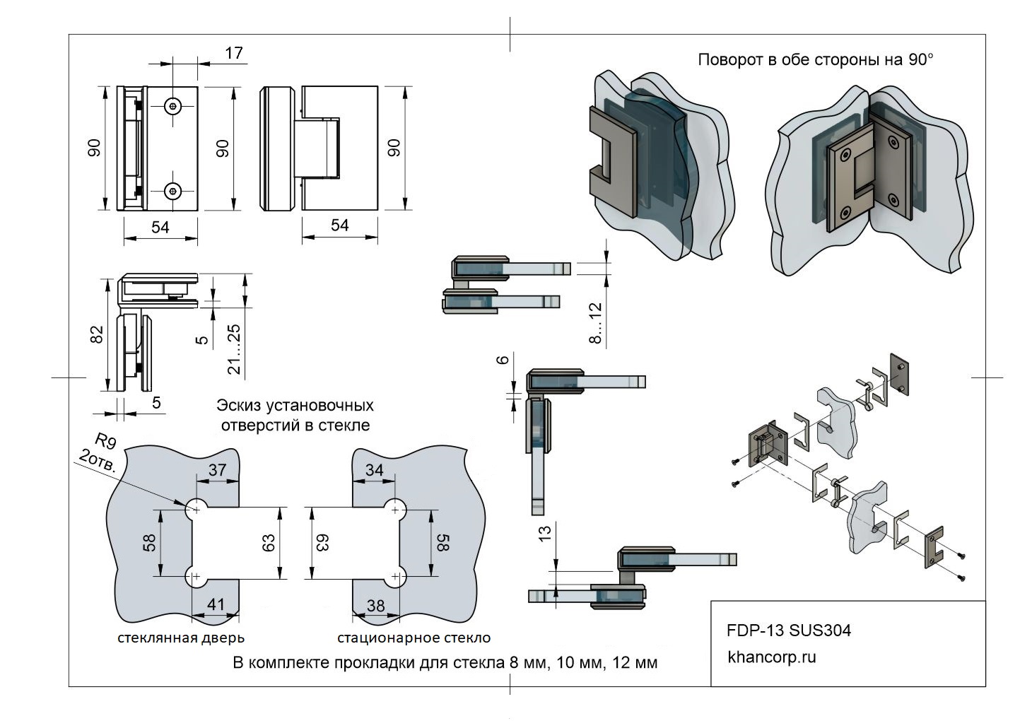 Петля Альфа для крепления стеклянной двери к неподвижному стеклу под углом 90°, соединение стекло-стекло. Душевая петля Альфа позволяет открывать дверь в обе стороны на 90 градусов в каждую.