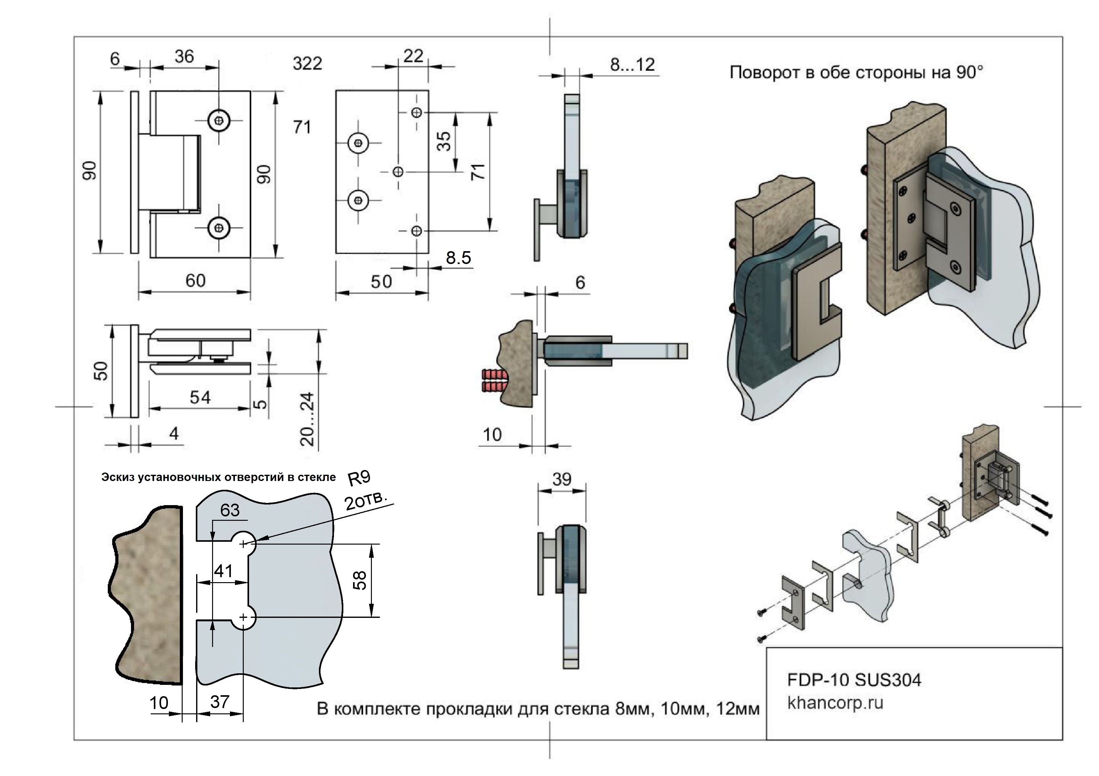 Подходит для закаленного стекла толщиной 8, 10, 12 мм. Изготовлена из нержавеющей стали с черной матовой отделкой, весит 564 г.