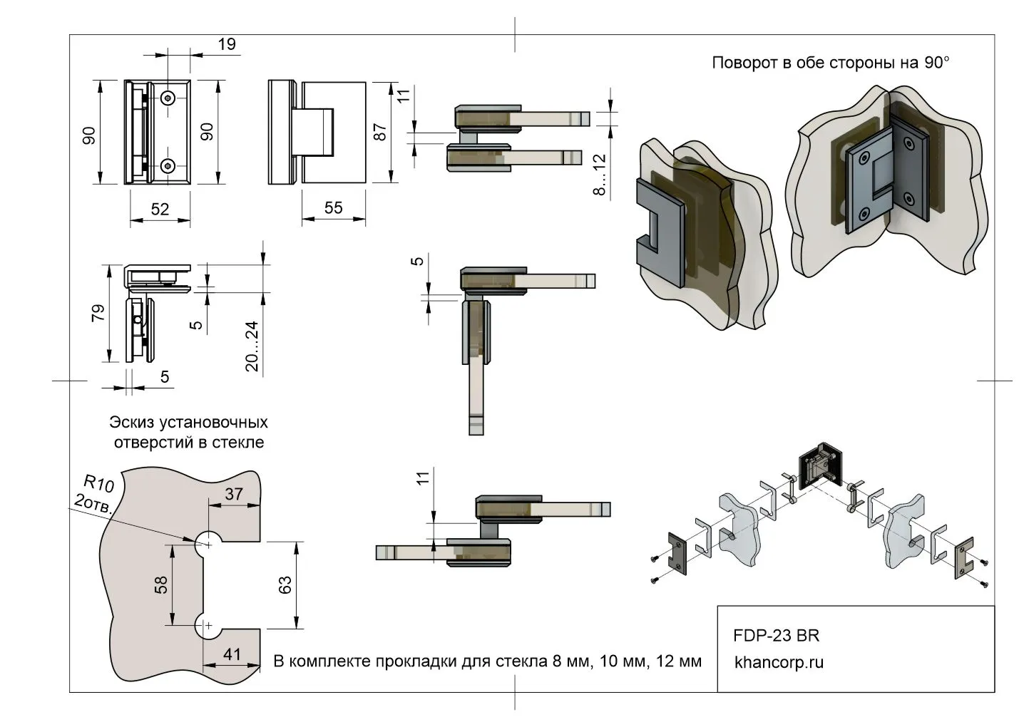 Фурнитура Бета FDP-23, предназначенная для фиксации стеклянной двери к неподвижной стеклянной панели под углом 90 градусов, соединение "стекло-стекло". Душевая петля Бета позволяет открывать дверь в обе стороны на 90 градусов. Разработана для использования с закаленным стеклом толщиной 8, 10 и 12 мм. Изготовлена из латуни высокого качества.