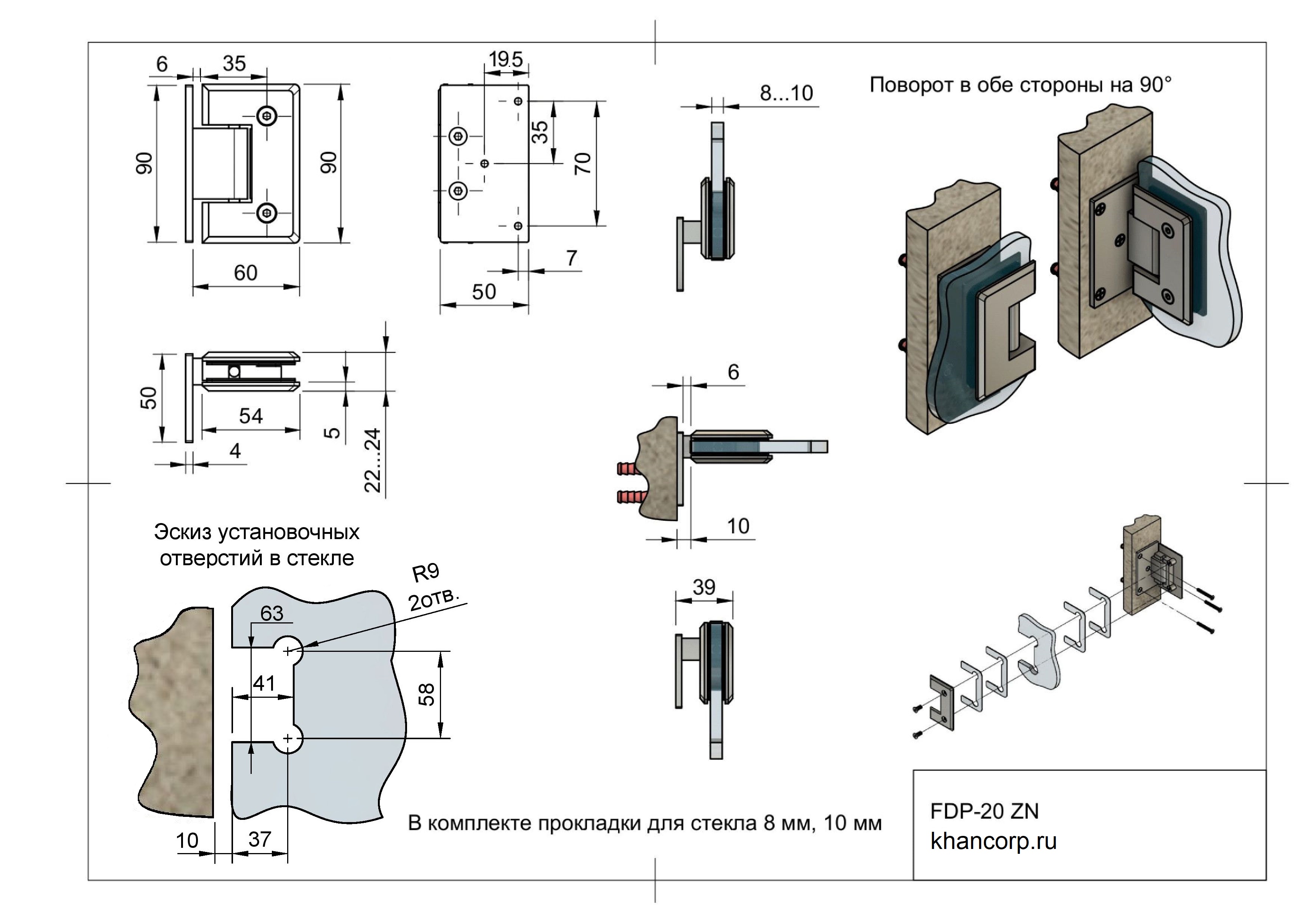 Петля Бета FDP-20 предназначена для стеклянных дверей, устанавливаемых под углом 90° к стене, в конфигурации "стекло-стена". Эта петля для душевой кабины позволяет двери свободно открываться в обоих направлениях на угол до 90°. Она разработана для использования с закаленным стеклом толщиной 8, 10 мм и изготовлена из прочного цинкового сплава высокого качества.