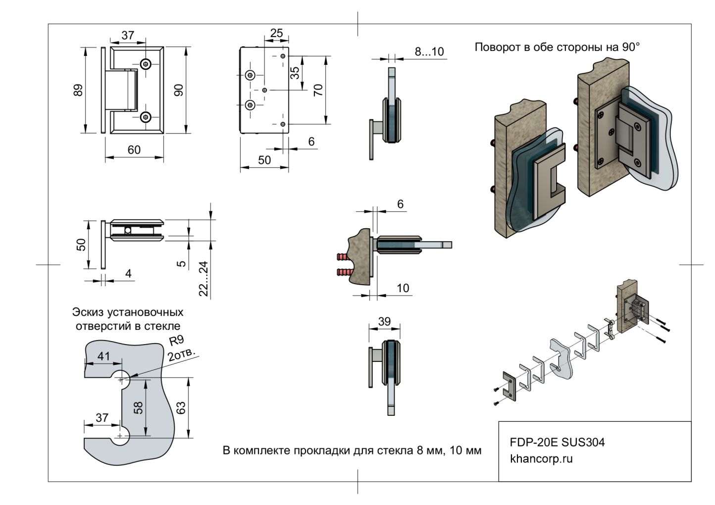 Петля Бета FDP-20E для стеклянных дверей, крепится к стене под прямым углом (90°), конфигурация "стена-стекло". Эта душевая петля позволяет двери открываться в обе стороны на 90 градусов. Подходит для закаленного стекла толщиной 8 или 10 мм. Изготовлена из нержавеющей стали с обработанной кромкой (фаской). Является аналогом петли Бета без фаски, а также петли Альфа FDP-10E из стали SUS304.