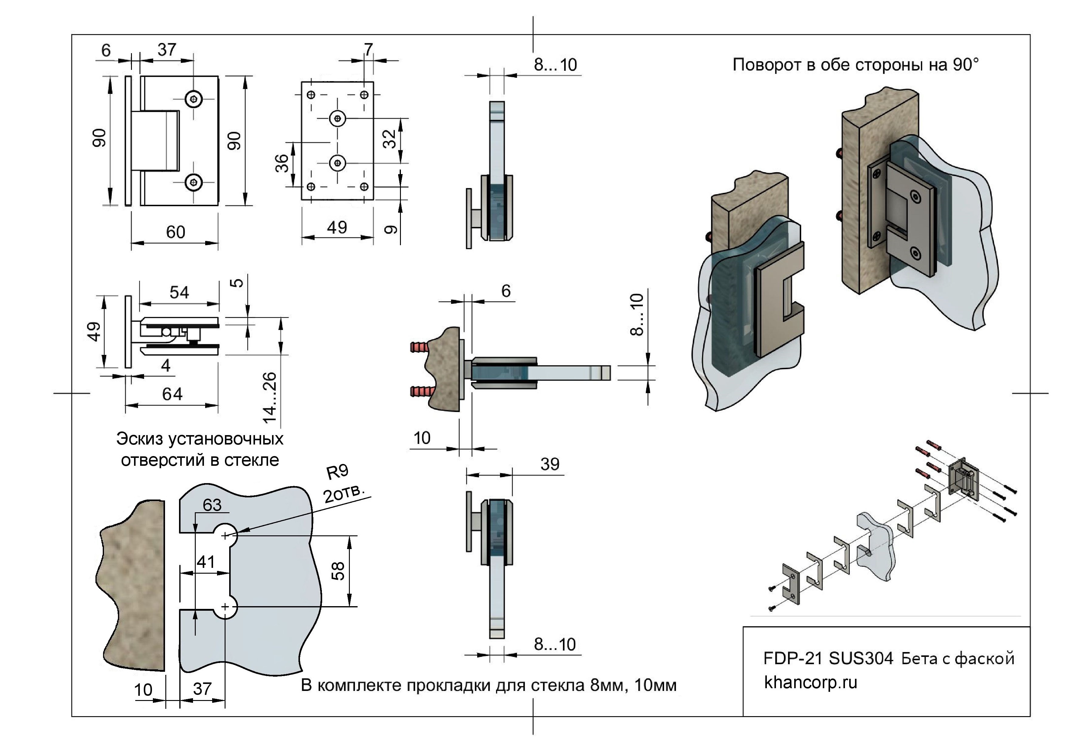 Петля Бета FDP-21 для стеклянных дверей, монтируемый в центре к стене под прямым углом (90°), соединяет стену и стекло. Душевая петля Бета позволяет двери свободно вращаться на 90 градусов в каждом направлении. Она разработана для использования со стеклянными закаленными полотнами толщиной 8, 10 мм. Изготовлена из первоклассной нержавеющей стали и имеет скошенную кромку. Альтернативой данной петли, но без скошенной кромки, является модель Альфа FDP-11 SUS304.