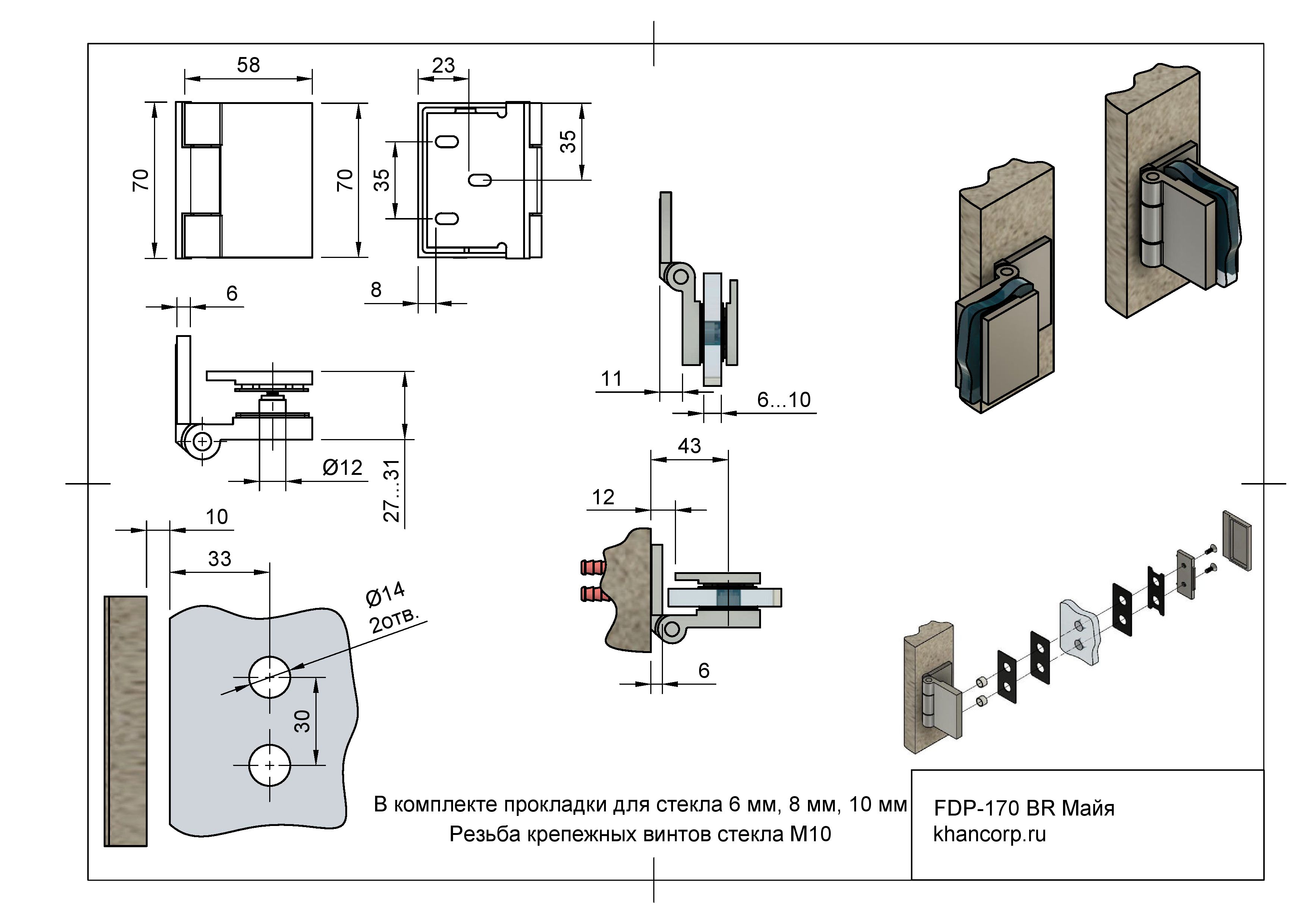 Петля «Майя» модели FDP-170 предназначена для монтажа стеклянной двери к стене под углом 90° («стена–стекло»). Комплектуется декоративными накладками для скрытого крепежа и резиновыми вставками. Относится к премиум-классу дверной фурнитуры благодаря идеальной поверхности, элегантному дизайну и высококачественным материалам. Позволяет дверь открывать наружу на угол до 90 градусов. Подходит для изделий из каленого стекла толщиной от 6 до 10 мм. Изготовлена из качественной латуни высокого класса.