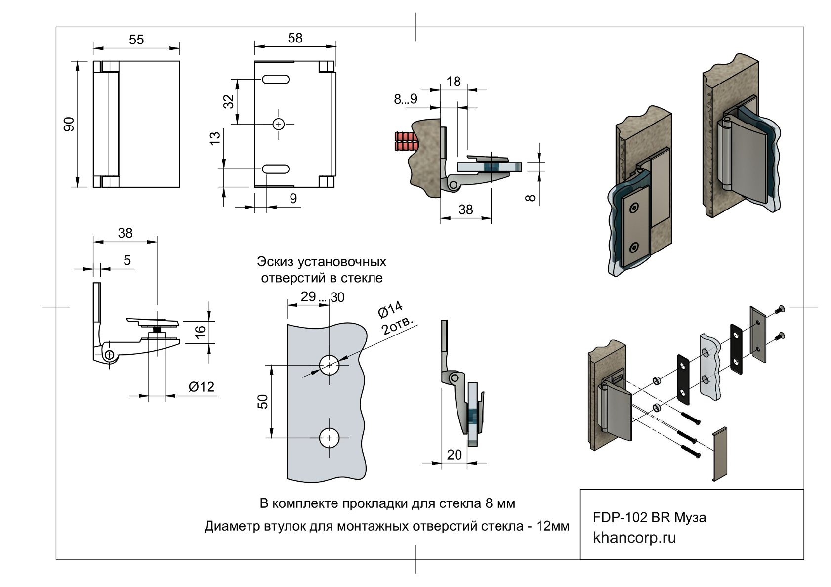 Петля FDP-102 для крепления стеклянной двери к стене под углом 90°, совместима с креплением «стена-стекло».