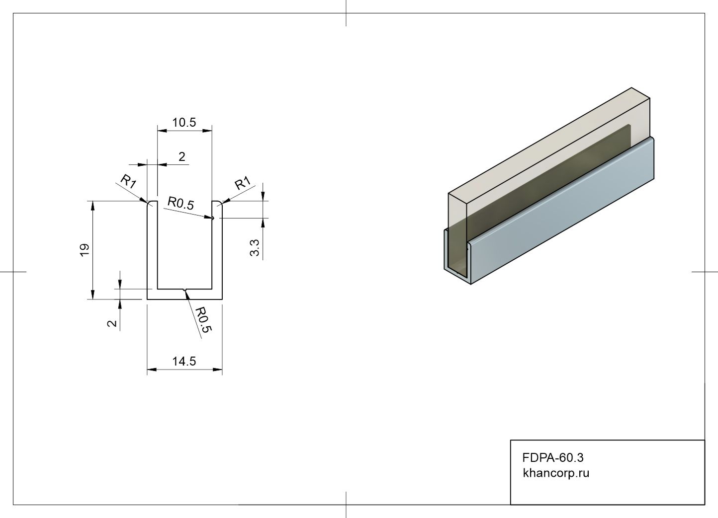 Алюминиевый П-образный профиль FDPA-60.3, размером 19х14,5х2 мм. Для использования со стеклом толщиной 10 мм. Материал: алюминий.