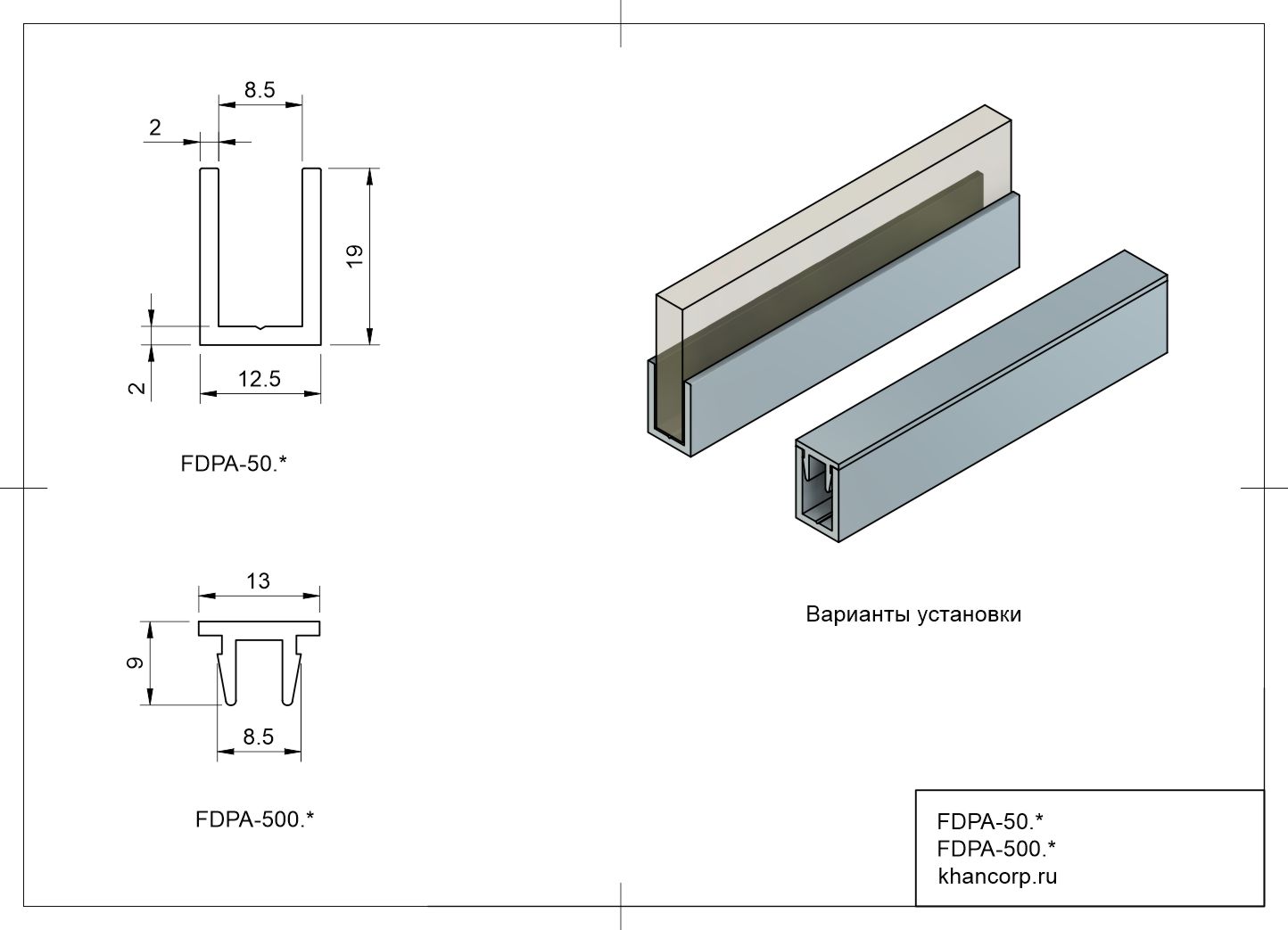 Алюминиевый П-образный профиль FDPA-50.3, размером 19х12.5х2 мм. Для использования со стеклом толщиной 8 мм. Материал: алюминий.