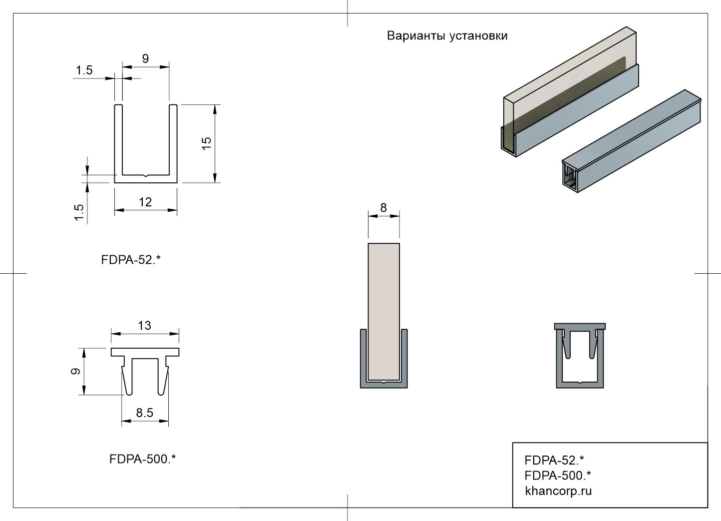 Алюминиевый П-образный профиль FDPA-55.22, размером 15х12х1.5 мм. Для использования со стеклом толщиной 8 мм. Материал: алюминий.