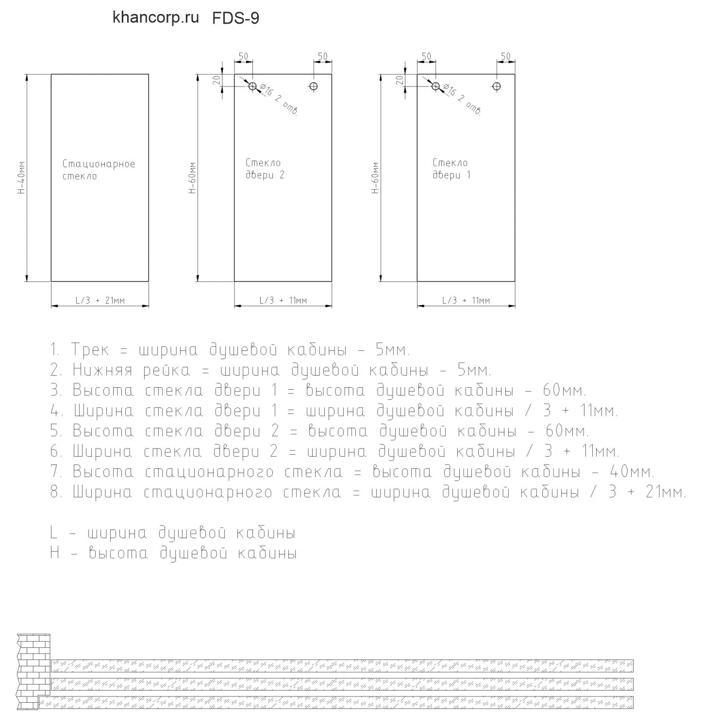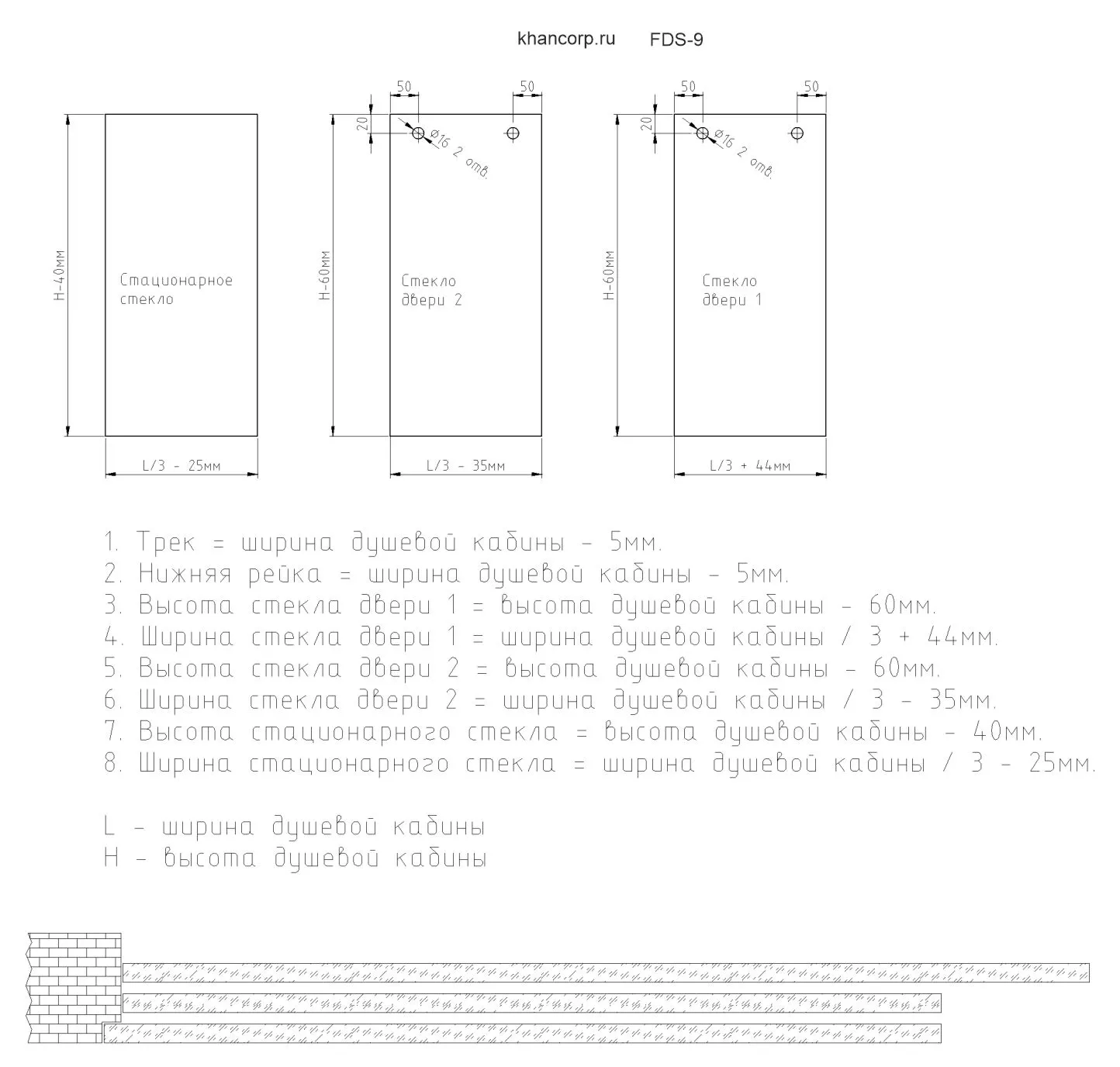— Нижние направляющие для размещения стеклянных полотен — 2 шт.,