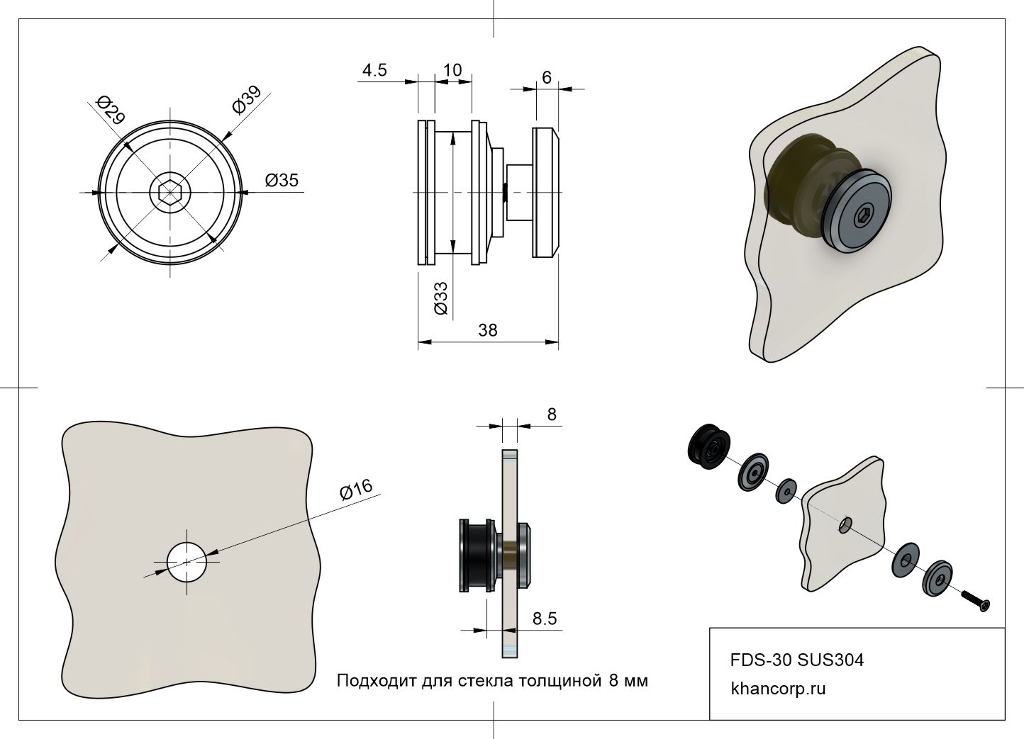 Данный ролик с креплением к стеклу FDS-30 совместим с комплектом "Раздвижная система Альфа α FDS-1 SUS304".