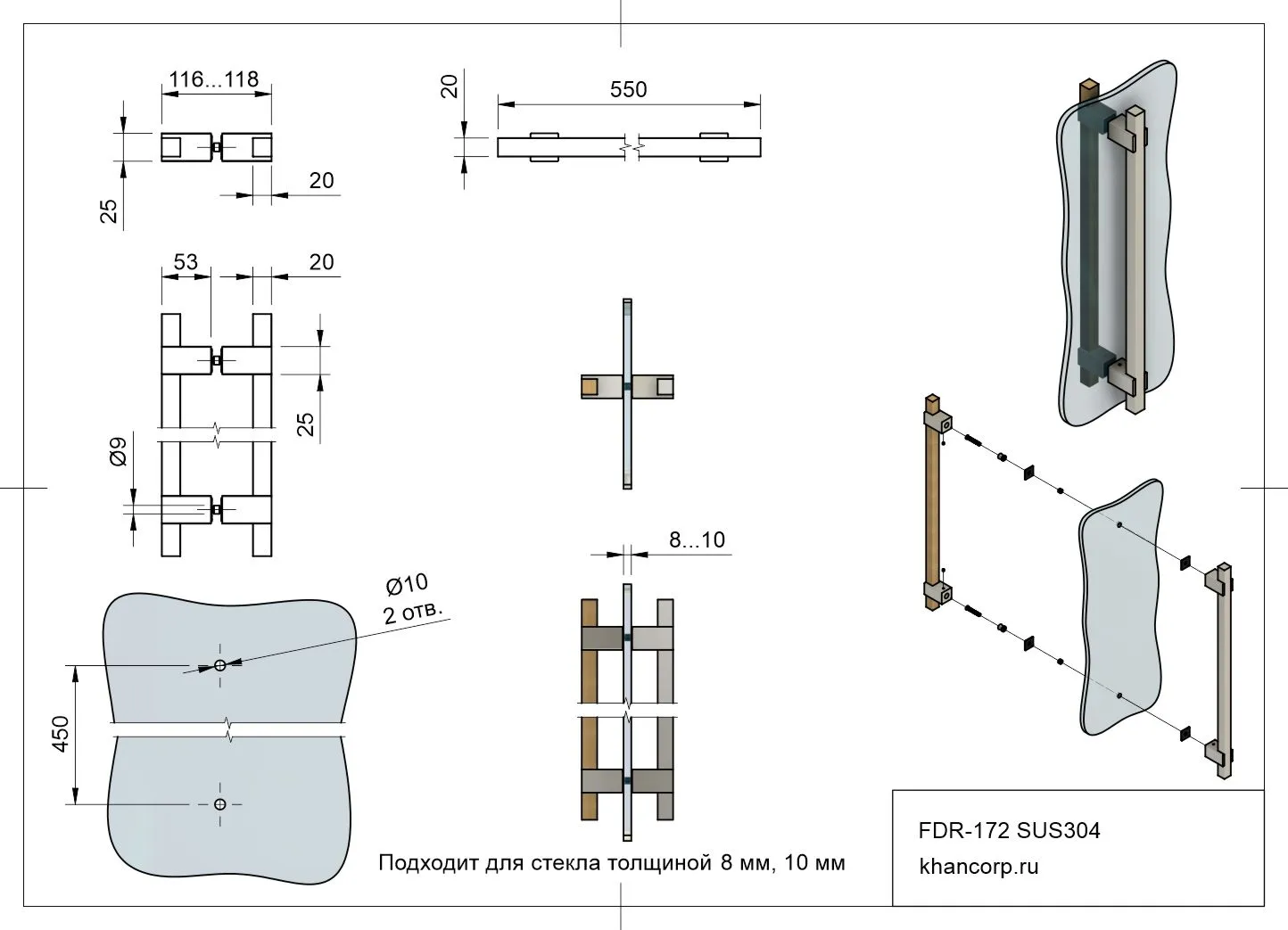 - Расстояние между осями точек крепления (межосевое расстояние) равно 450 мм, что позволяет надежно зафиксировать ручку на большинстве типов дверей.
