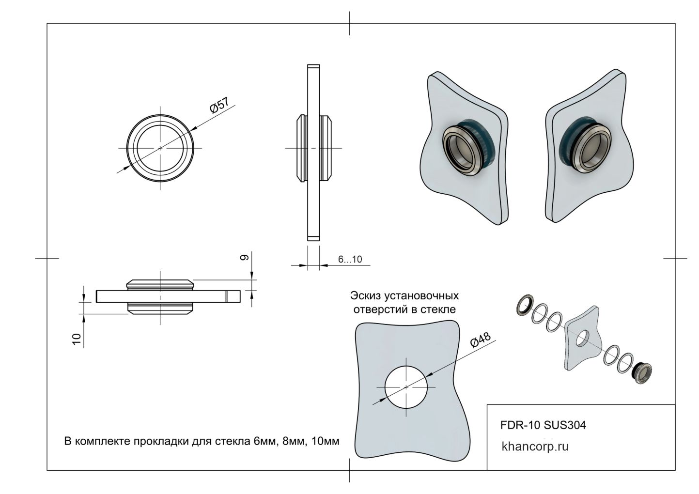 Ручка купе FDR-10 предназначена для удобного открывания и закрывания стеклянных раздвижных дверей душевых кабин. Изготовлена из нержавеющей стали, совместима с панелями толщиной от 8 до 12 мм. Особенности конструкции: отсутствие сквозного отверстия (имеется лишь монтажный вырез). Внешний диаметр рукояти составляет 58 мм, диаметр посадочного места — 48 мм.
