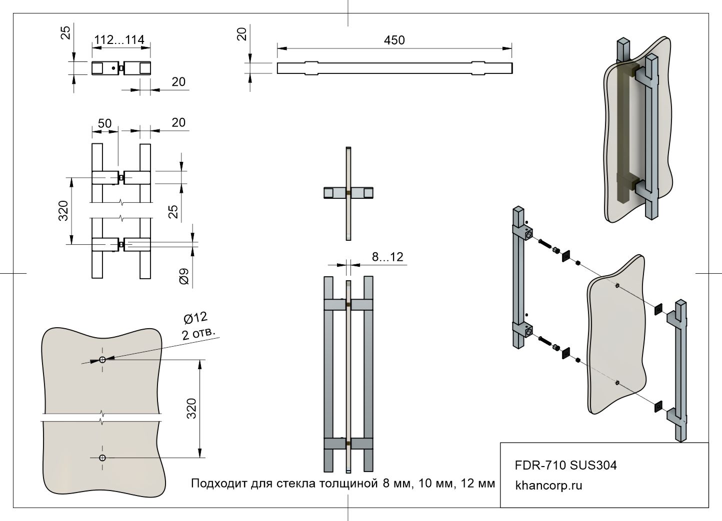 Ручка FDR-710 выполнена в форме скобы и изготовлена из нержавеющей стали толщиной 1 мм, что обеспечивает ей высокие антикоррозийные свойства и продолжительный срок службы. Её межцентровое расстояние составляет 320 мм, что делает возможным удобный захват и лёгкое управление дверью душевой кабины. Основной способ установки — вертикальный, однако возможны и другие варианты, исходя из особенностей конкретной обстановки.