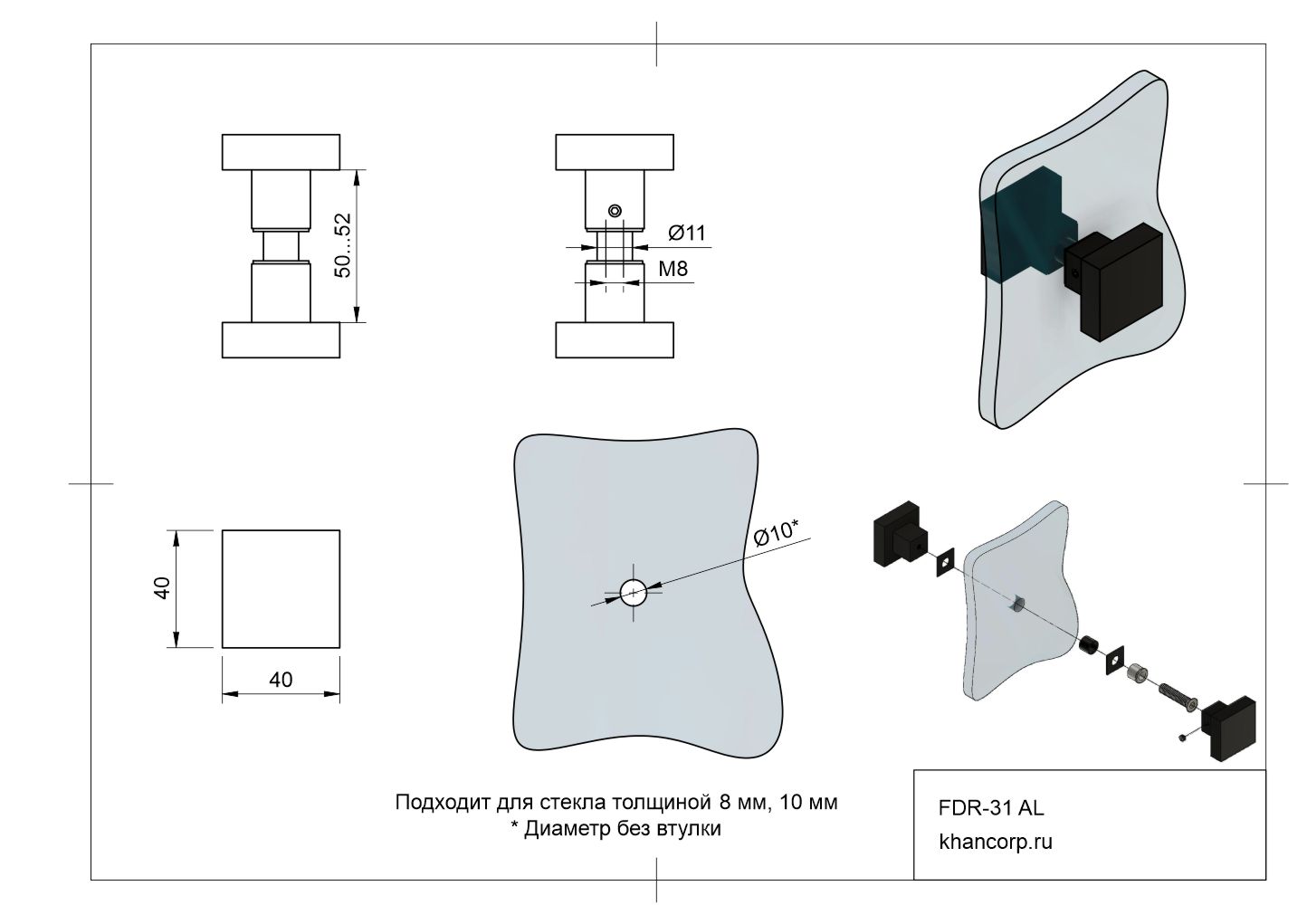 Вырез в стекле должен иметь диаметр 12 мм, указанный с учётом наличия специальной установочной втулки. Втулка является дополнительной деталью и не обязательна при монтаже. Профессиональные мастера нередко обходятся без неё, сокращая диаметр отверстия до 10 мм. Фиксируется ручка с помощью винтов с диаметром резьбы М8.