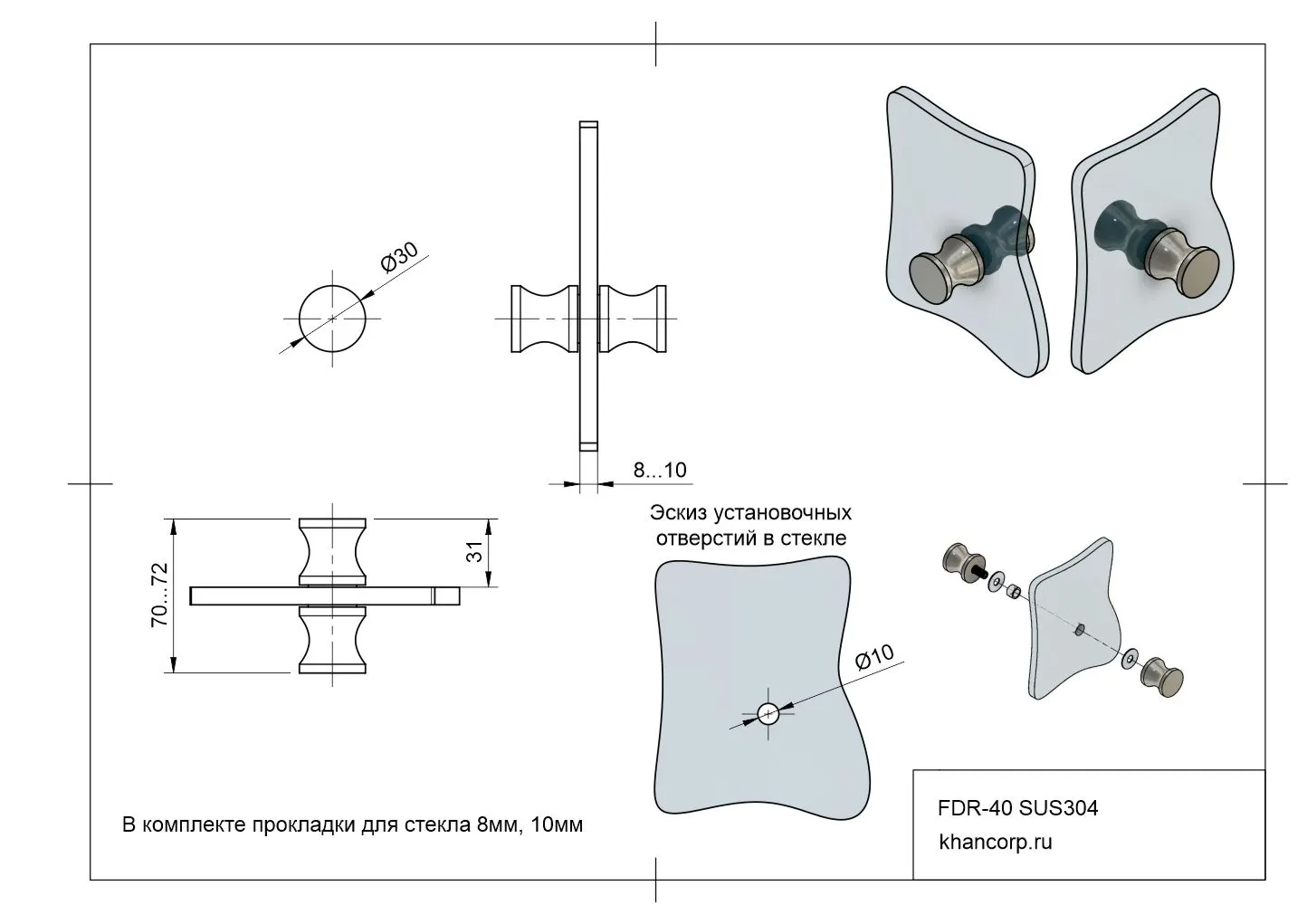 Рекомендуемый диаметр отверстия в стекле для установки данной ручки составляет 10 мм, указанный показатель приведён без учёта возможной пластиковой втулки. Использование втулки не является обязательным условием установки. Опытные профессионалы нередко монтируют ручку без втулки, полагаясь на аккуратность обработки отверстий. Если же планируется использование втулки, следует предусмотреть небольшой запас в размере примерно 2 мм, увеличив таким образом диаметр отверстия.