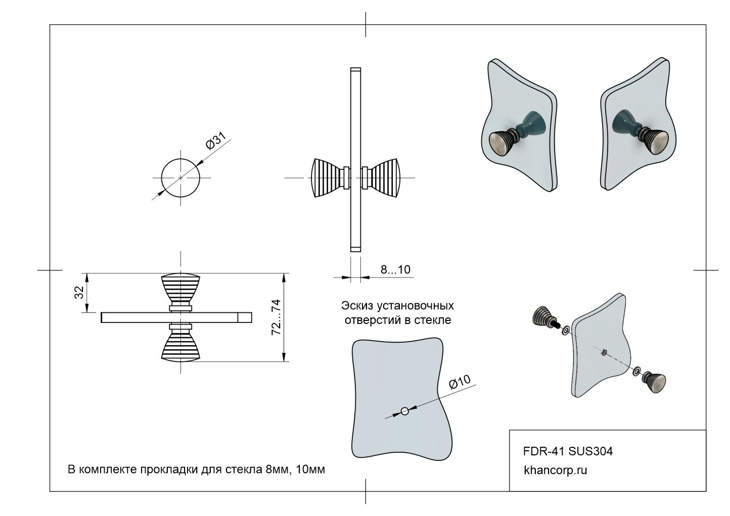 Ручка идеально подходит для установки на стеклянные панели стандартной толщины от 8 до 10 мм. Для удобства монтажа предусмотрена пластиковая втулка, которая защищает кромку стекла от повреждений и делает соединение более надежным. Важно учитывать, что рекомендуемый диаметр отверстия в стекле равен 12 мм именно с учётом размещения втулки внутри.