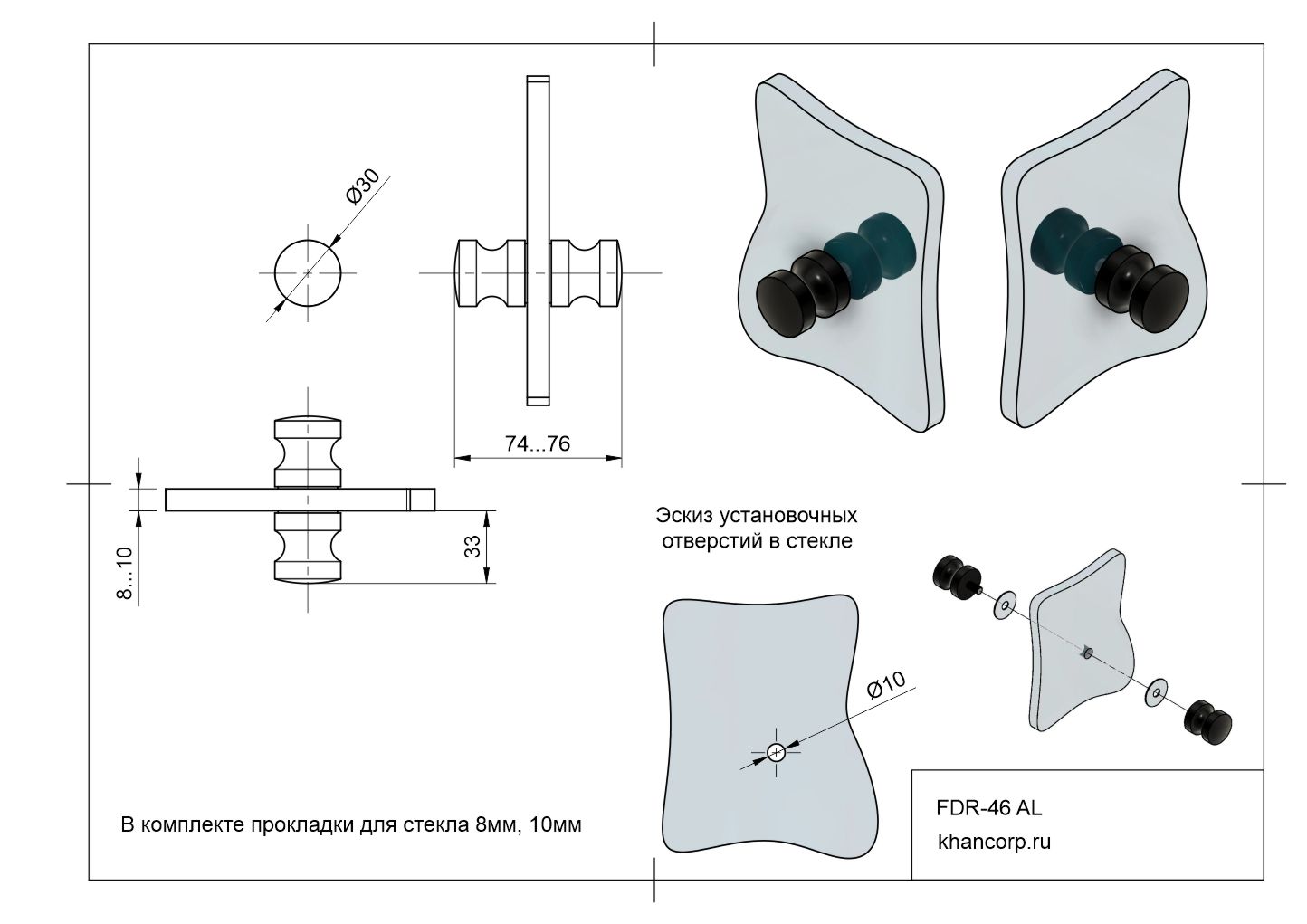 Конструктивные особенности включают круглые контуры диаметром 30 мм и симметричный отступ от края ручки до поверхности стекла по 33 мм с каждой стороны, что обеспечивает оптимальный хват и комфорт при эксплуатации. Во время установки руководствуйтесь следующим: диаметр отверстия в стекле должен составлять 12 мм, этот показатель учитывает наличие пластиковой втулки, используемой для защиты кромки стекла. Тем не менее, использование втулки не является обязательным условием, и многие специалисты предпочитают отказаться от нее, выбирая диаметр отверстия 10 мм.