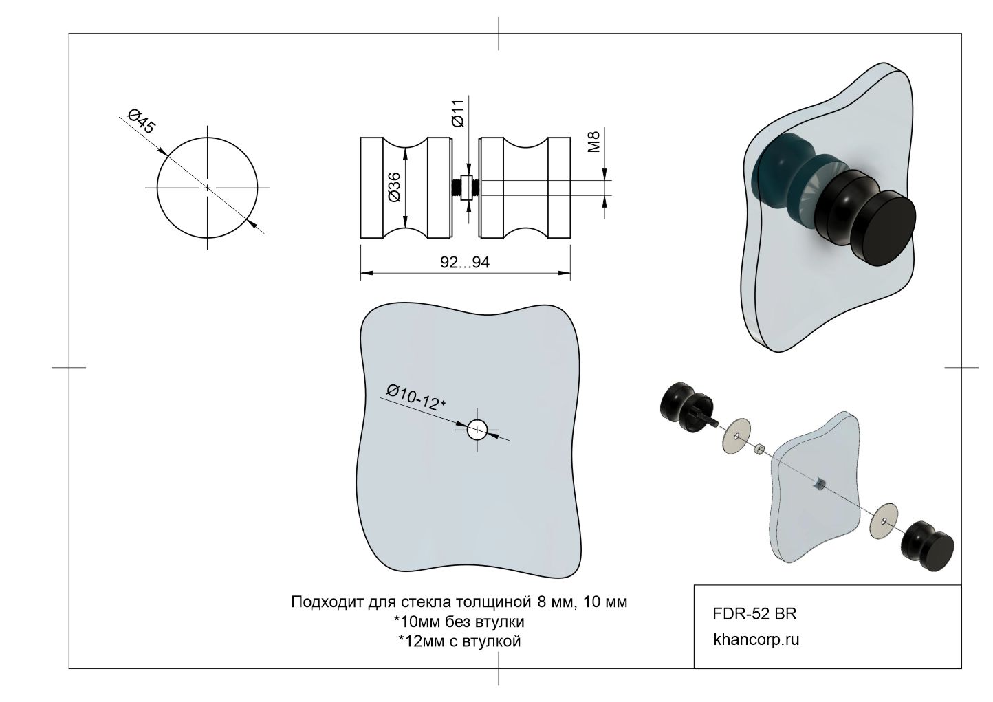 Ручка-кноб модели FDR-52 предназначена для эффективного открывания и закрывания распашных стеклянных дверей душевых кабин. Изготовлена из высококачественного материала — латуни, что обеспечивает долговечность и устойчивость к внешнему воздействию, включая влагу и механические нагрузки. Продукт предназначен для установки на стеклянные полотна толщиной от 8 до 10 мм, что гарантирует надежное и длительное функционирование устройства.