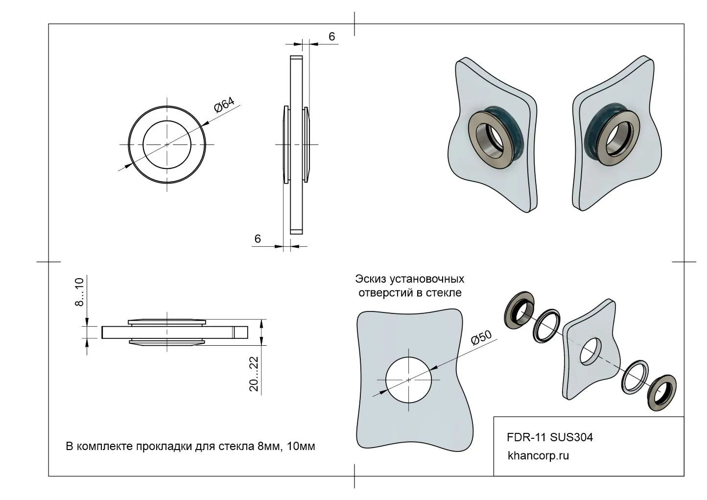 Ручка купе FDR-11 предназначена для открывания и закрывания стеклянных раздвижных дверей душевых кабин. Изготовлена из нержавеющей стали и подходит для установки на панели толщиной 8 и 10 мм. Конструктивная особенность данной модели — наличие сквозного отверстия, что важно учесть при проектировании конструкции душевой кабины. Внешний диаметр ручки составляет 64 мм, внутренний — 39 мм, диаметр монтажного выреза — 50 мм.