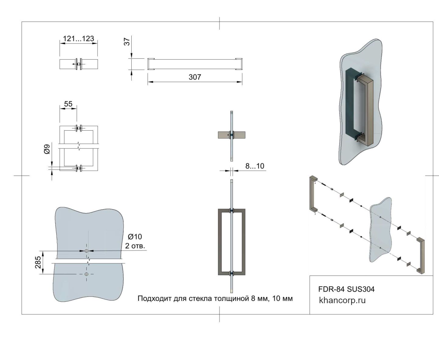 Ручка FDR-84, выполненная в форме скобы, изготовлена из высококачественной нержавеющей стали, что гарантирует её устойчивость к коррозии и длительную эксплуатацию в условиях повышенной влажности. Интервал между осями крепления составляет 285 мм, что обеспечивает оптимальную прочность и надежность крепления. Продукт предназначен для установки на стеклянные панели душевых кабин с толщиной стекла от 8 до 10 мм, что соответствует стандартам большинства современных моделей.