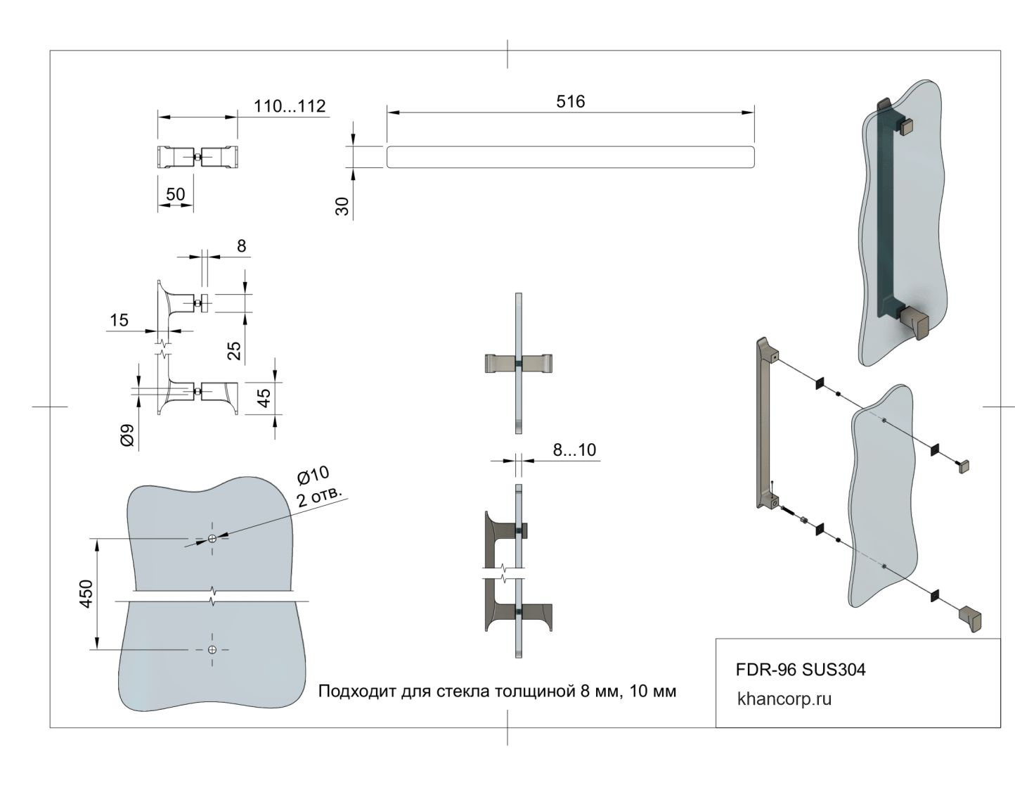 Ручка модели FDR-96, выполненная в форме скобы, изготовлена из нержавеющей стали толщиной 1 мм, что обеспечивает ей высокую устойчивость к воздействию влаги и долговечность. Межцентровое расстояние составляет 450 мм, что позволяет комфортно разместить ручку на стеклянных дверях душевых кабин различного формата.